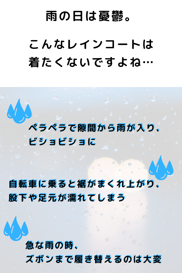 また、レインパンツを履く面倒もなく土砂降りの大雨でも体全体を包んで濡れることを防ぎます。