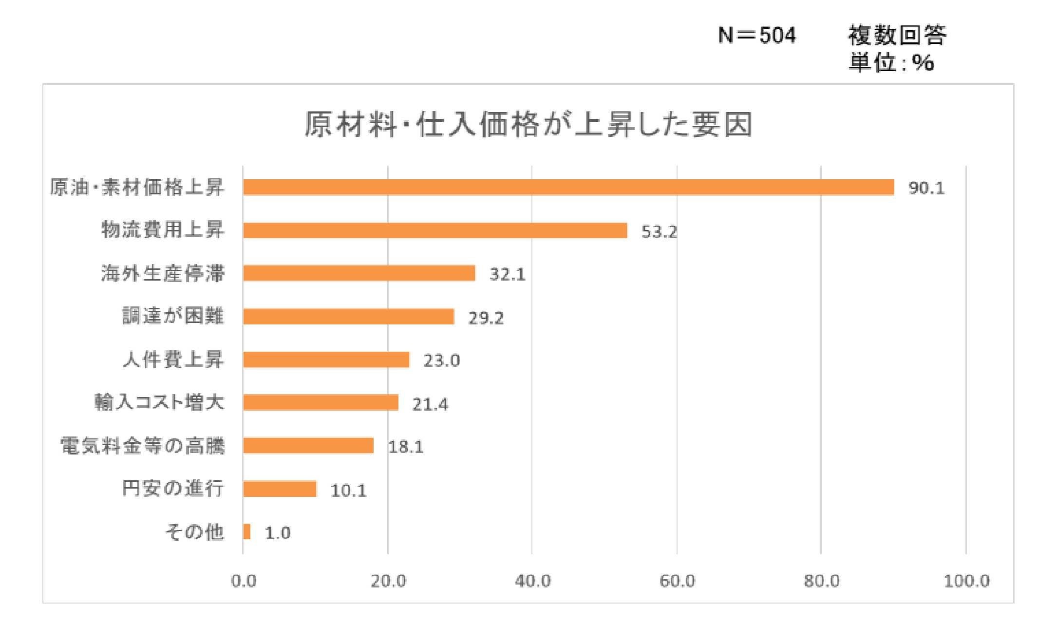 「大きく上昇」53.3%、「少し上昇」37.1%と原材料・仕入価格の上昇が中小企業全体に及んでおり、「原油・素材価格の上昇」90.1%が最大の要因となりました。