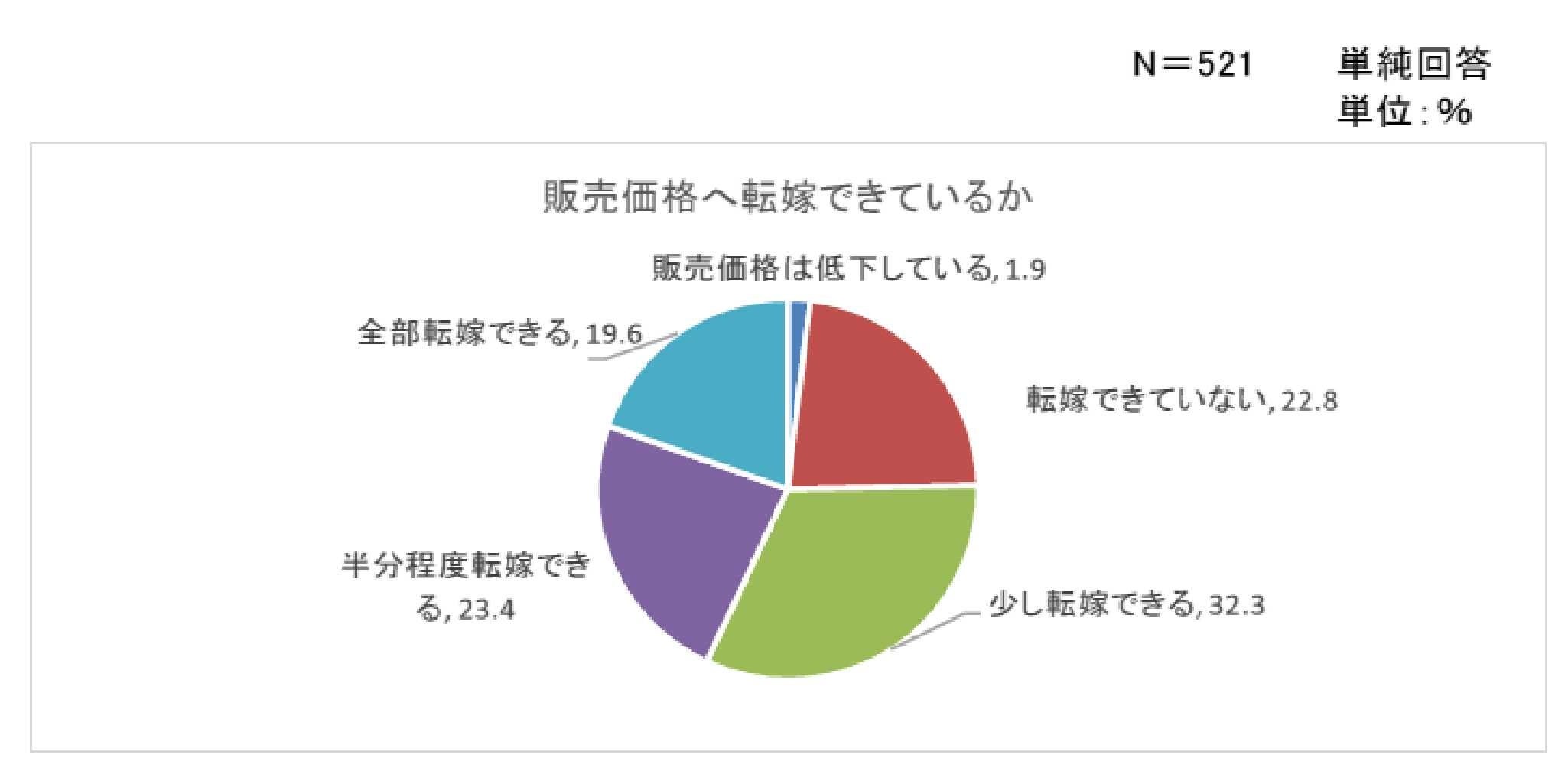 「販売価格への転嫁」69.3%が取り組んでいますが、価格転嫁受け入れ状況は「半分程度転嫁」23.4%、「少し転嫁」32.3%、「転嫁できない」22.8%と十分な効果が得られていない状況にあります。「取引先の了解を得られない」47.9%、「競合他社に取引を奪われる」47.5%が主な要因となっており、中小企業では十分な価格交渉が進まない経営環境にあるといえます。