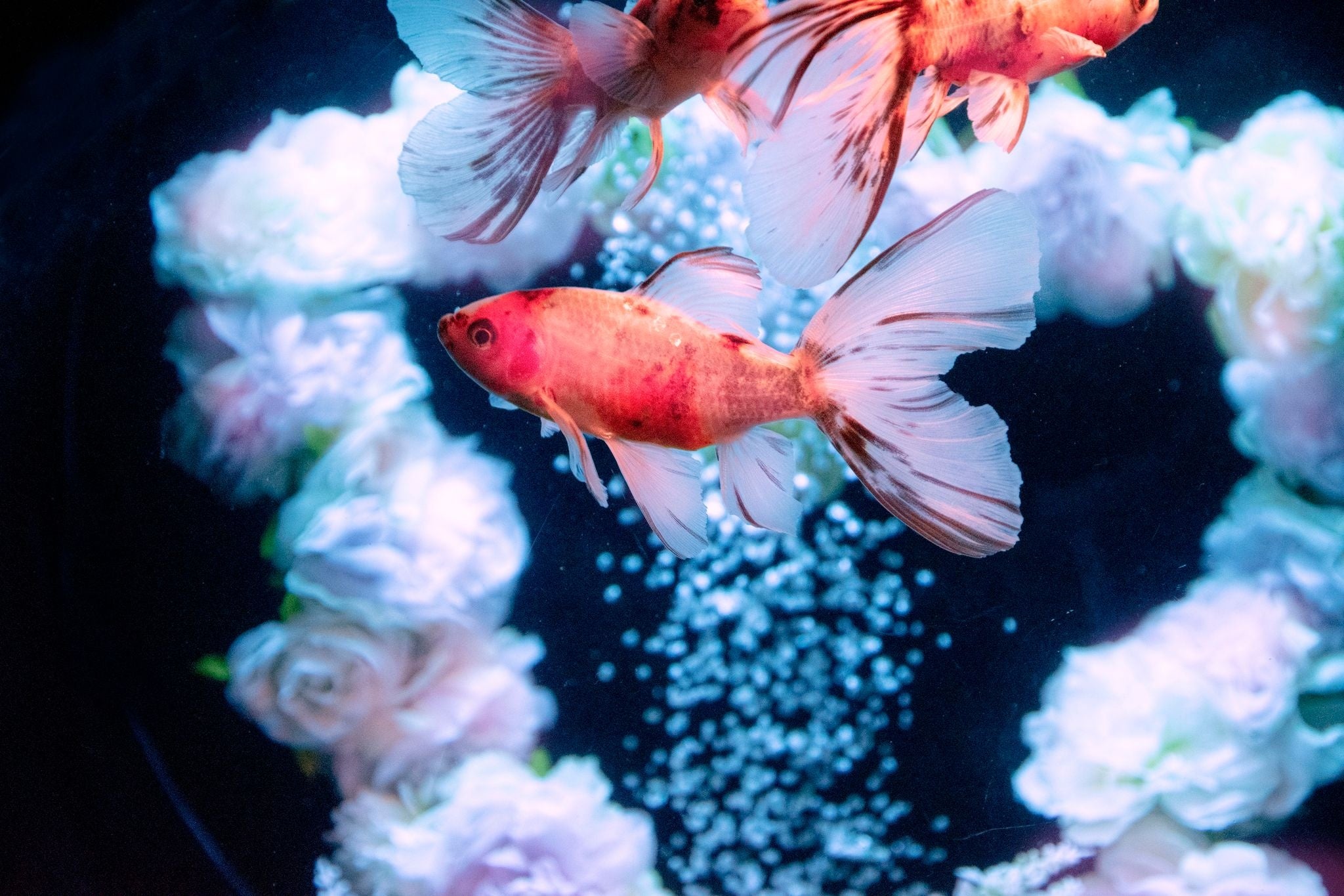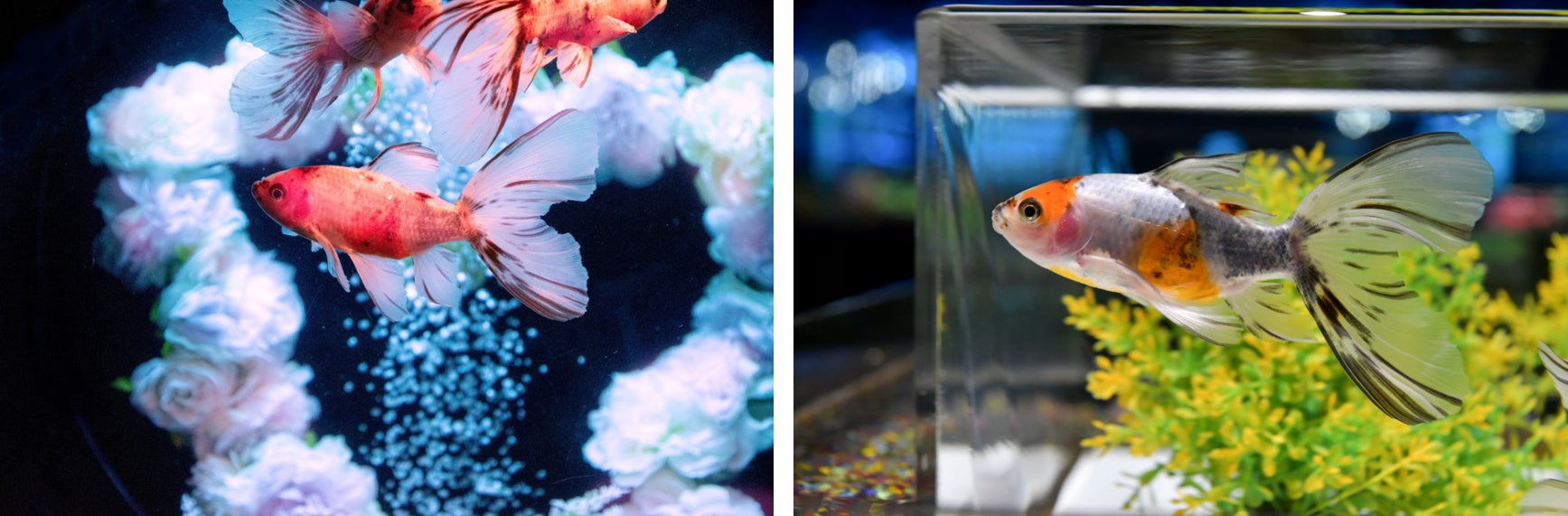 丸みを帯びた尾が上下に広がり、ハート形になった特徴をもつ種類。その美しい特徴をよく見ていただけるよう、金魚を“横見”で鑑賞することができる「金魚コレクション」という作品エリアで展示します。バレンタイン期間では、このブリストル朱文金が泳ぐ水槽内をピンクの薔薇で飾り、とっても可愛い雰囲気で彩ります。