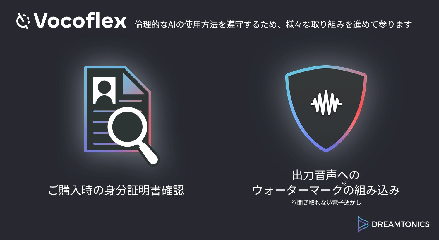 私たちは倫理的なAIの使用方法を遵守し、道徳的・法的な一線は決して踏み越えてはならないと考えています。また、アーティスト、俳優、ボーカリスト、ユーザーの皆さまの完全な知識と透明性をもって、クリエイティブな可能性を広げるために「Vocoflex」を使用することを奨励しています。