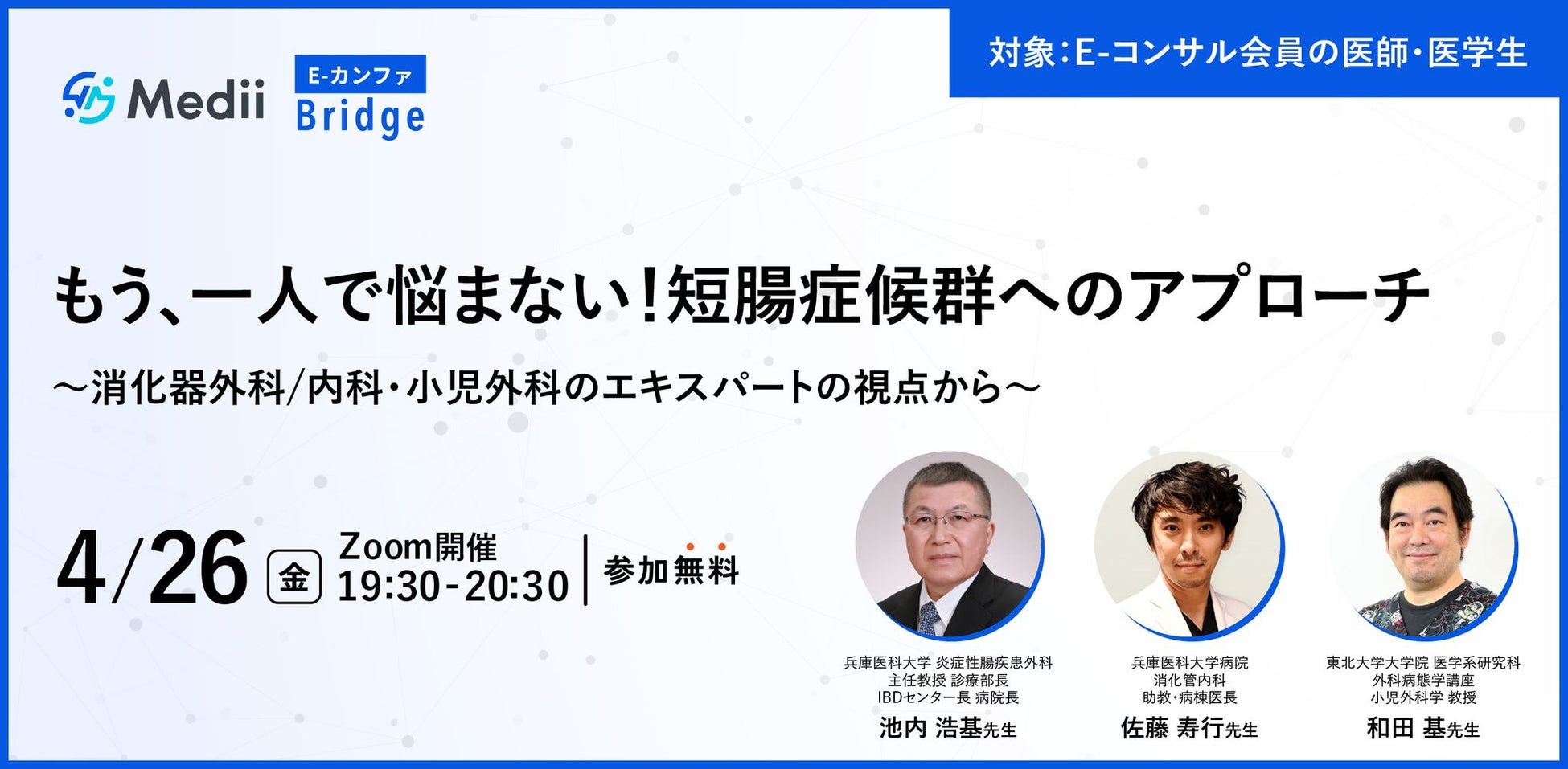 また、多くの合併症がある短腸症候群の治療へのアプローチについて、様々な診療科の視点からエキスパート専門医と議論する医師向けオンラインセミナーを4/26(金)に開催します。栄養療法を中心に症例ごとの治療選択の方法や最新の治療選択について経験豊富なエキスパートに語っていただきます。