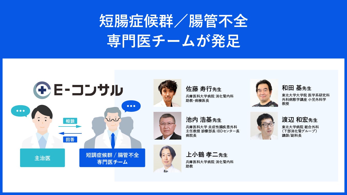 株式会社Medii(本社:東京都新宿区、代表取締役医師:山田裕揮、読み:メディ、以下Medii)は、短腸症候群患者の適切な治療を促進することを目的に、医師専用オンライン専門医相談サービス「E-コンサル」において、短腸症候群に関する豊富な経験と最新知見を持つ多診療科を横断したエキスパート専門医チームを発足しました。E-コンサルを通じて、治療方針の選択が難しい短腸症候群患者を診療する主治医は、短腸症候群/腸管不全 専門医チームにグループチャットで無料相談ができるようになります。