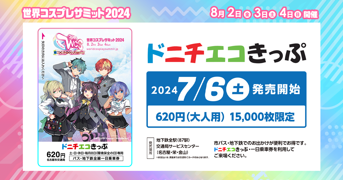 世界コスプレサミットの開催を記念して、特別デザインの「ドニチエコきっぷ」を7/6(土)から15,000枚限定発売いたします。このきっぷは、週末および祝日に名古屋市営地下鉄・市バスを自由に乗り降りできる便利なきっぷです。通常の料金よりもとてもお得な価格設定となっています。コスプレイヤーやイベント参加者を含むすべての皆様にとって、移動がよりスムーズで楽しいものとなるようサポートします。地下鉄全駅(87駅)、交通局サービスセンター(名古屋・栄・金山)にて購入することができます。