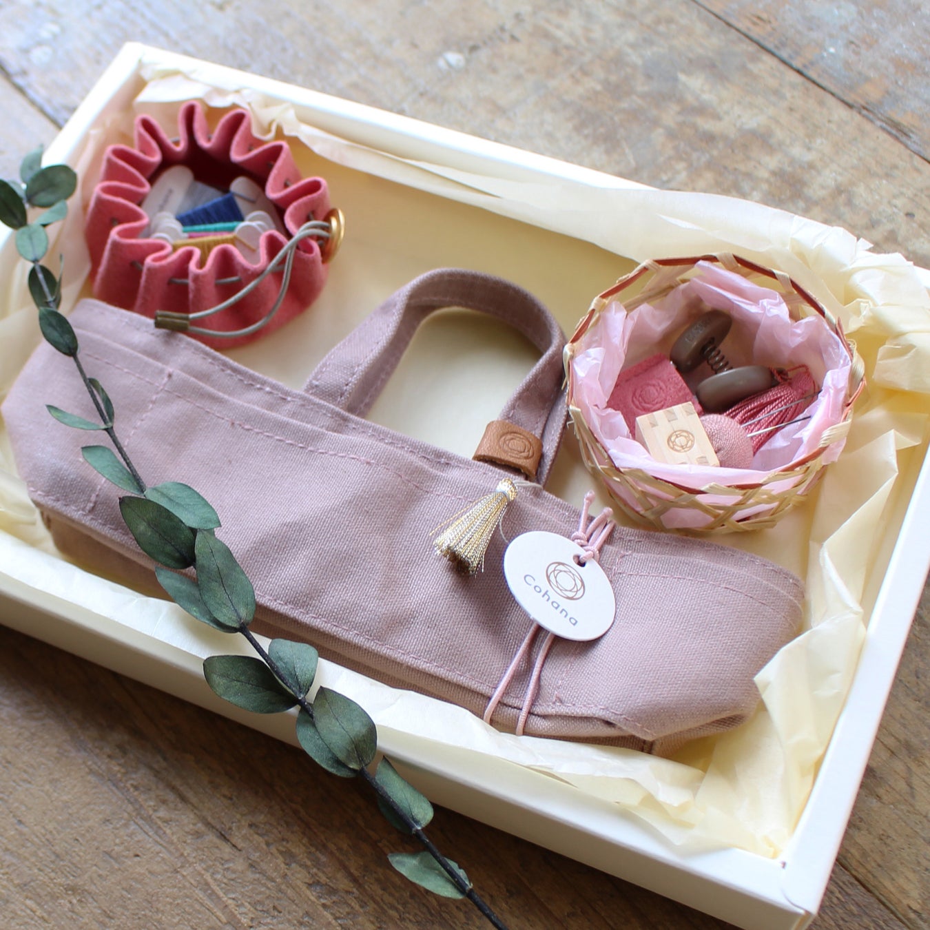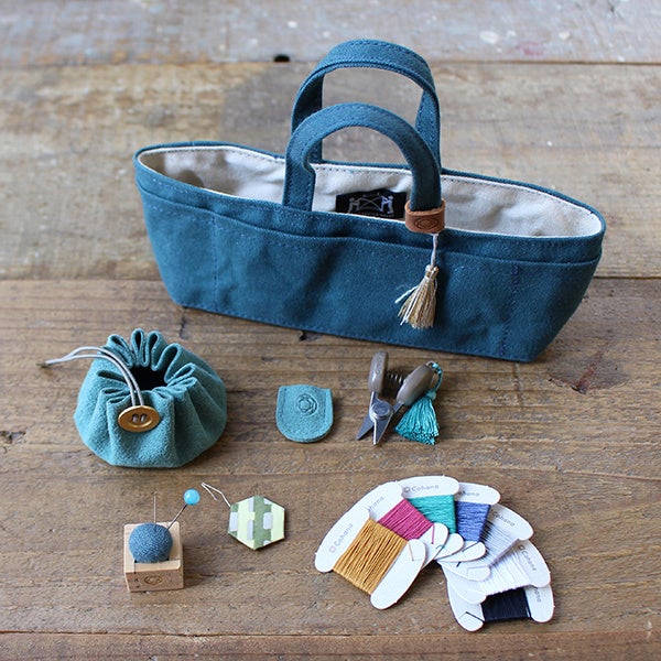 Cohanaならではの豆サイズの道具は、小さいながらも使いやすくて機能的。帆布の豆道具入れにぴったりな「榛原千代紙の豆糸通し」や「豆糸7色セット」が入っています。豆巾着は豆道具入れの持ち手に付けたり、豆道具入れの仕切りとしても活用できます。豆糸のセットの収納にも便利です。 (※数量限定での販売。商品がなくなり次第、販売終了です)