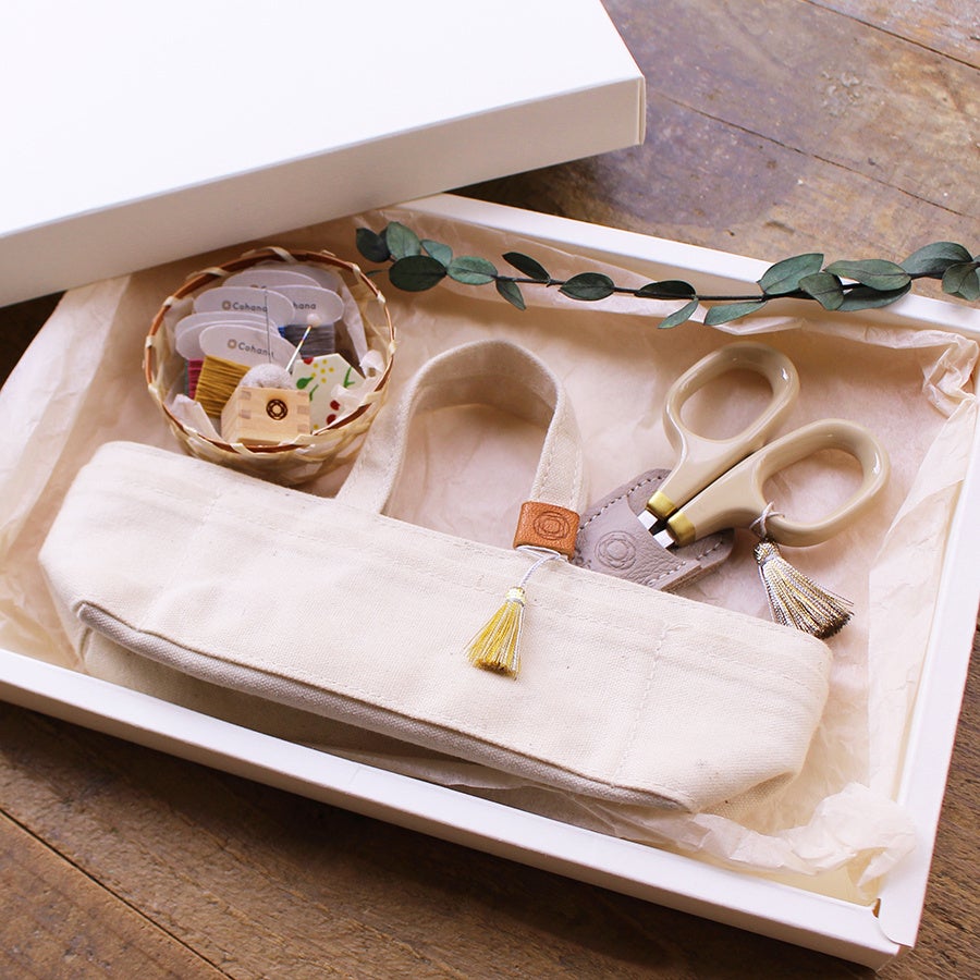 ・セット内容:帆布の豆道具入れ、漆と金蒔絵の小ばさみ しろ *、豆枡の針山・待針1本・縫い針1本、榛原千代紙の豆糸通し *、豆糸7色セット *(各色3m巻) *限定アイテム