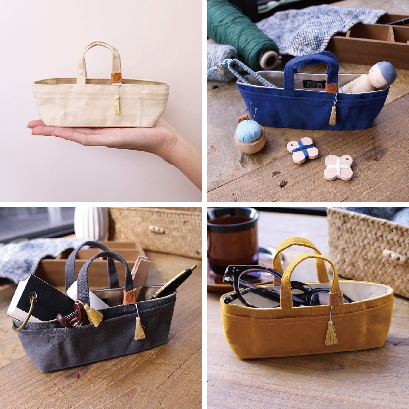 外側360度全面にポケットが付いていて小物の収納に便利な人気の<帆布の道具入れ>をデザインそのままに、豆サイズに小さく仕立てた「帆布の豆道具入れ」。帆布の生地にはパラフィン加工が施されており、撥水性があり、耐久性に優れています。7周年を記念して、新色が仲間入りし全部で7色!手芸のシーンがパッと華やぐカラー展開です。手のひらサイズの小ささながら、たっぷりの収納が可能です。お裁縫道具をセットにしたり、デスク周りの小物の整理やスタイリッシュな眼鏡ケースとしても楽しんでいただけます。