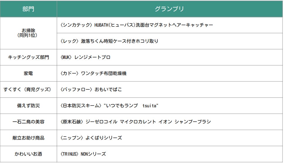 各部門のグランプリは、ユーザーの皆様からの投票によって選出されました。「今まで面倒だった家事が楽になった&時短できた!」「いつも使っています!もう手放せません!」などの推薦のコメントが寄せられました。