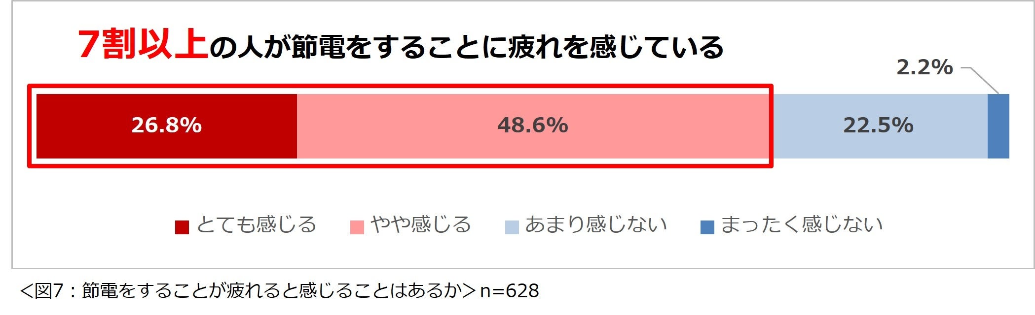 日常的に節電をしていると回答した628名に「節電をすることが疲れると感じることはありますか?」と尋ねたところ、「とても感じる」(26.8%)「やや感じる」(48.6%)と回答した人を合わせると7割以上の人が、節電をすることに疲れを感じていることがわかりました。(図7)