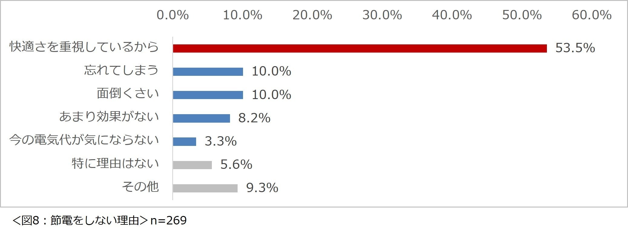 日常的に節電をしていないと回答した 269 名にその理由について尋ねたところ、「快適さを重視しているから」が最も多く半数以上の人が回答しました。(図8)