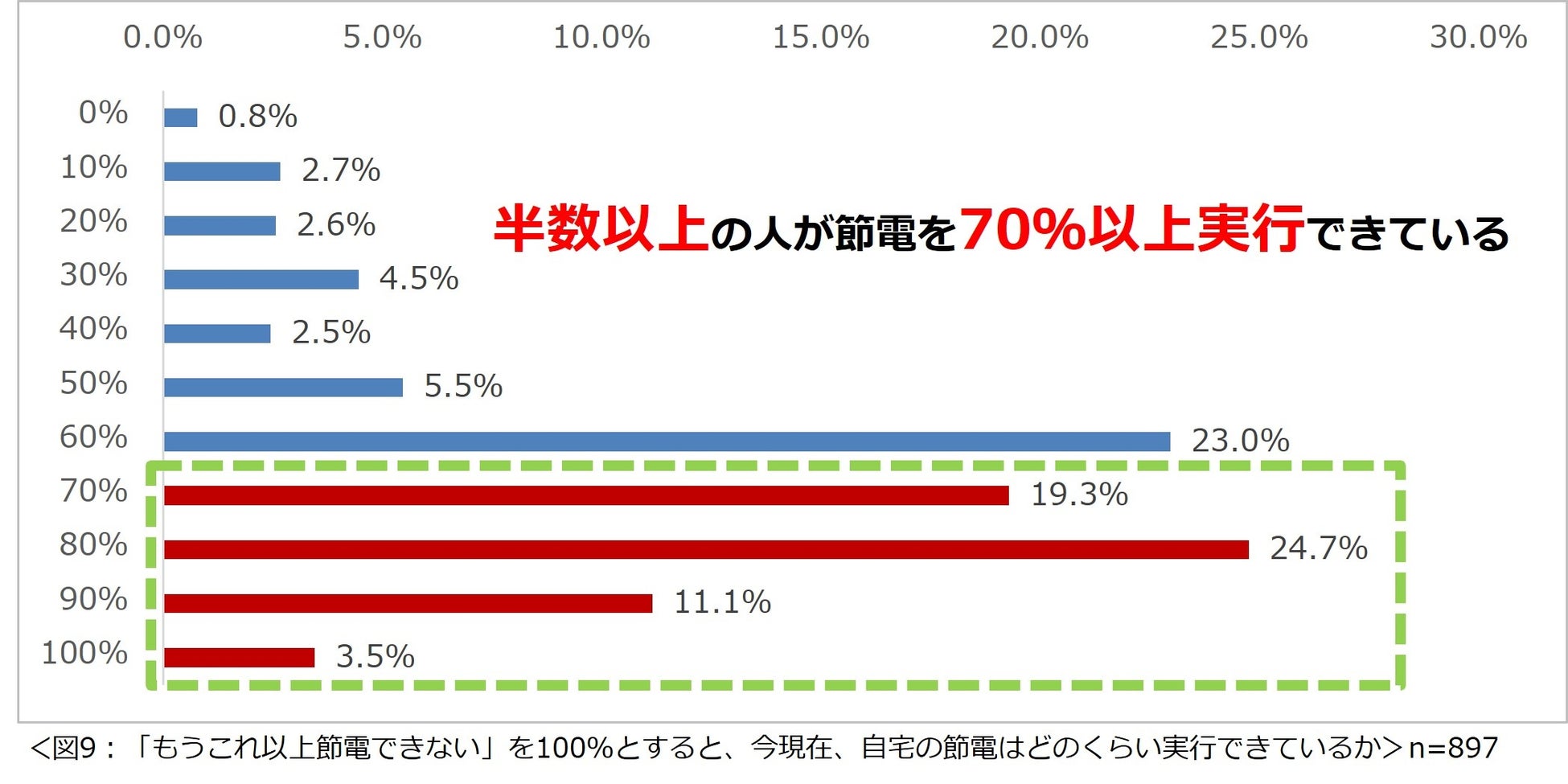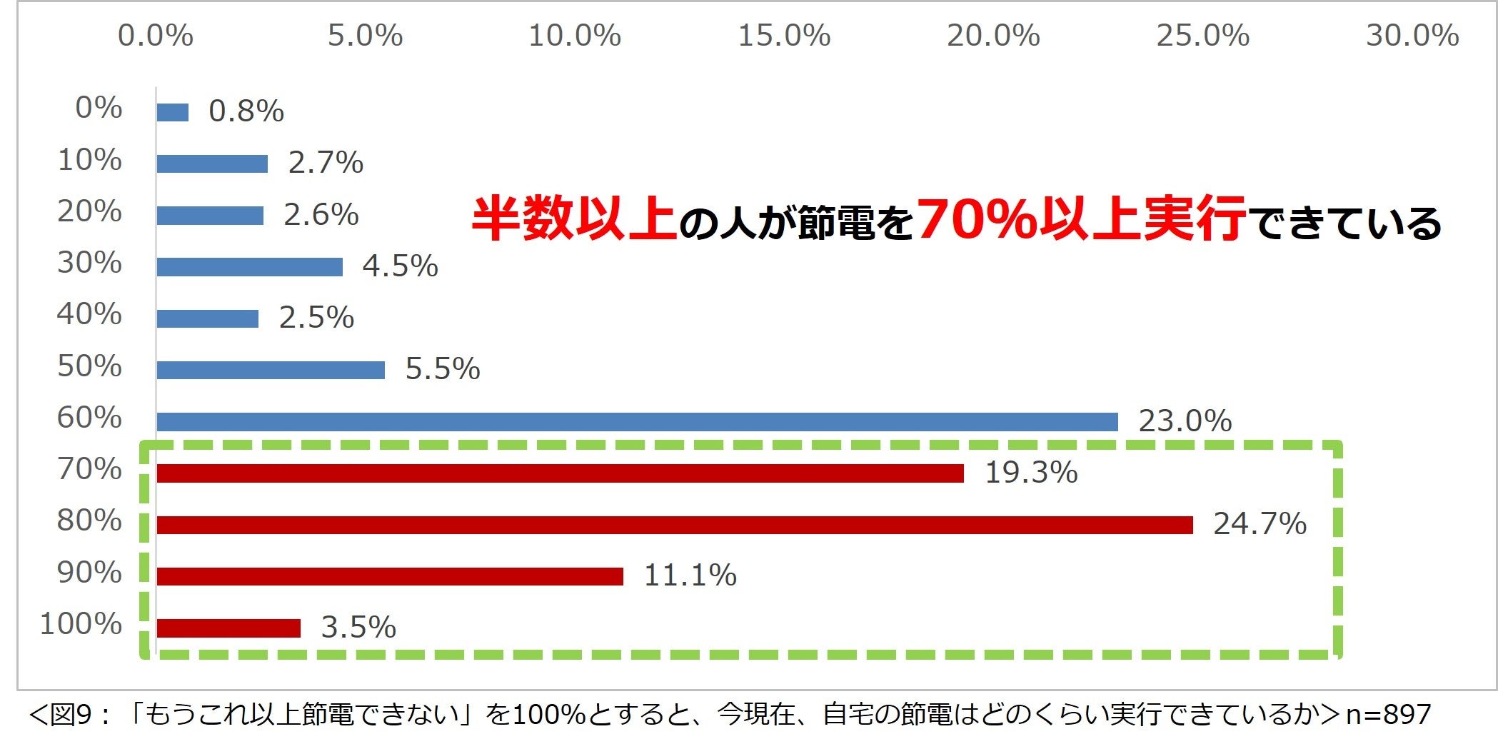 「『もうこれ以上節電できない』を100%とすると、今現在、ご自宅の節電はどのくらい実行できていると思いますか?」と尋ねたところ、70%以上できていると回答した人が半数以上いました。(図9)