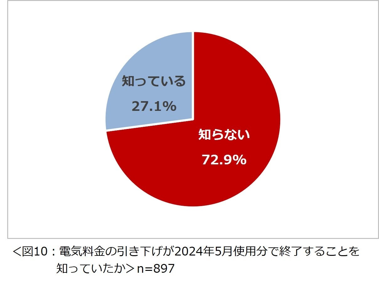 「政府が実施している『電気・ガス価格激変緩和対策事業』による電気料金の引き下げが2024年5月使用分で終了することを知っていますか?」と尋ねたところ、7割以上の人が「知らない」と回答しています。(図10)