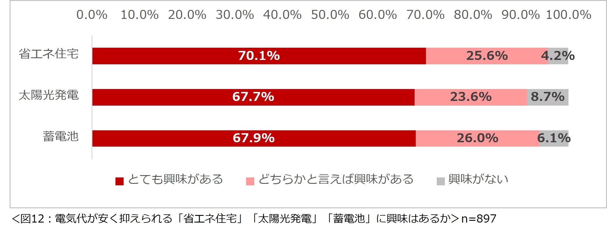 電気代が安く抑えられる「省エネ住宅」「太陽光発電」「蓄電池」に興味はあるか尋ねたところ、それぞれ「とても興味がある」、「どちらかと言えば興味がある」を合わせると、3項目全て9割以上の人が電気代を安く抑えられる商品として興味を持っていることがわかりました。(図12)