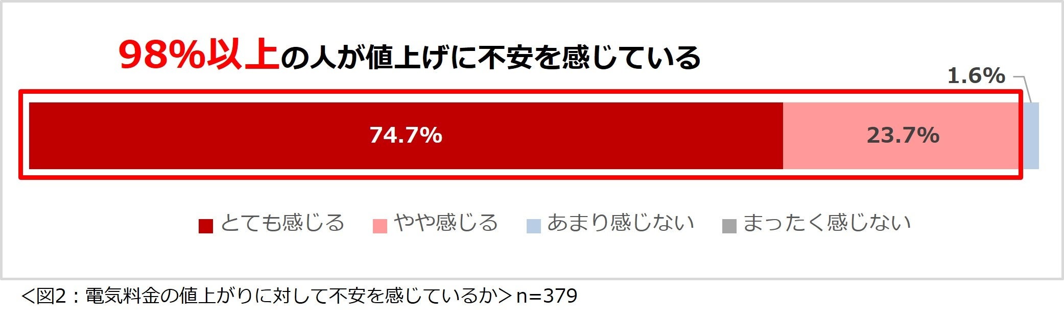 また、「電気代」と回答した379名に「電気料金の値上がりに対して不安を感じていますか?」と尋ねたところ、「とても感じる」と回答した人は7割以上となり、「やや感じる」(23.7%)と回答した人と合わせると、98%以上の人が不安を感じていることがわかりました。(図2)