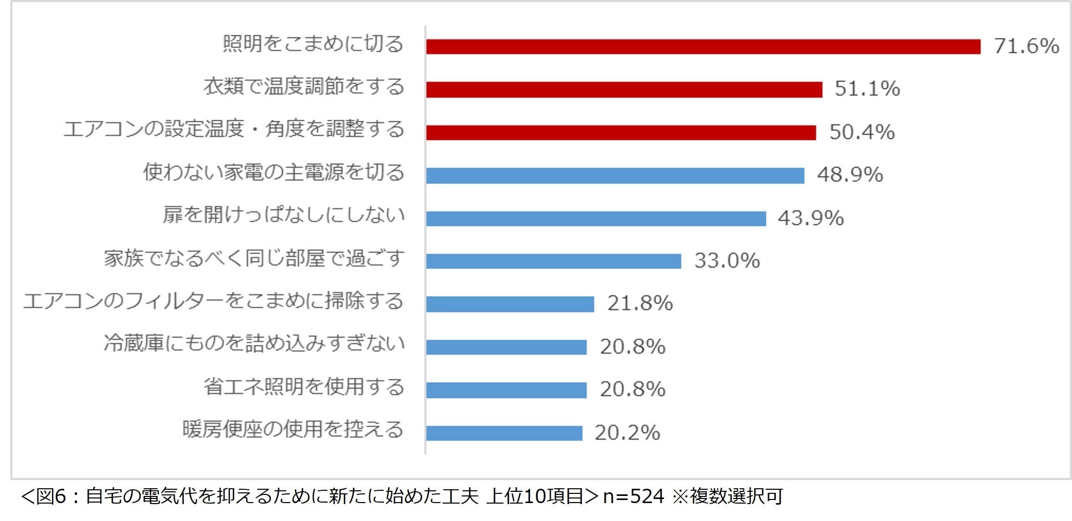 2021 年からの電気料金高騰を受けて、さらに節電をするようになったと回答した524名に「自宅の電気代を抑えるために新たに始めた工夫は何ですか?」と尋ねたところ、「照明をこまめに切る」が最も多く71.6%の人が回答、「衣類で温度調節をする」( 51.1%)、「エアコンの設定温度・角度を調整する」(50.4%)と続きました。(図6)
