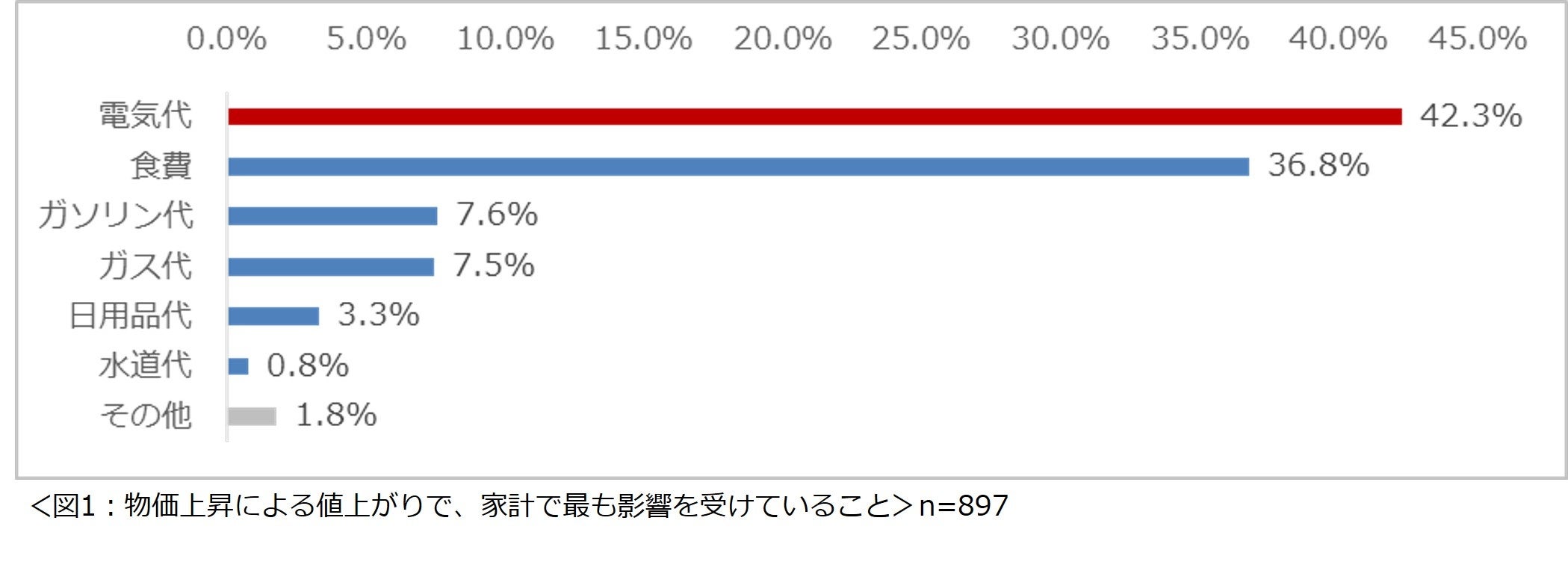 「物価上昇によって、家計で最も影響を受けているのは何ですか?」と尋ねたところ、最多が「電気代」で、4割以上の人が回答しました。(図1)
