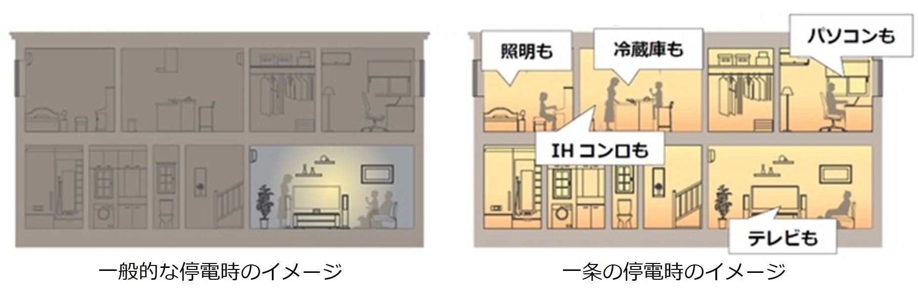 停電時、一般的なパワーコンディショナーは、太陽光パネルが発電している間だけ非常用コンセント1口から1.5kVA しか使用できないものが主流です。しかし、一条工務店のオリジナルパワーコンディショナーは、太陽光パネルで創った電気に加え、蓄電池に充電した電気を家中に供給し、昼も夜も最大で5.5kVA 使うことができます。これにより、停電時でもほぼ普段通り(※6)の生活が維持できます。