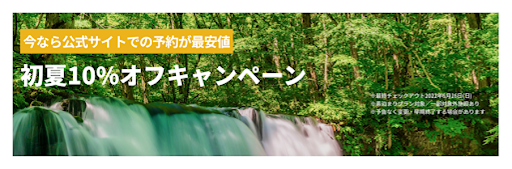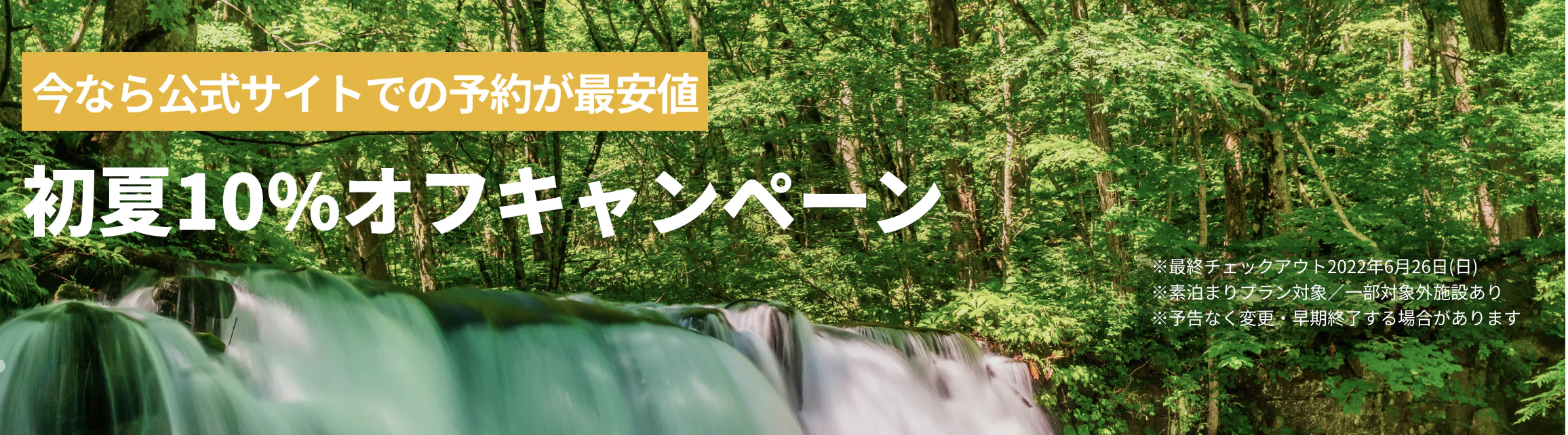 <初夏10%オフキャンペーン:2022年5月23日〜6月26日> 今なら公式サイトでの予約が最安値の10%オフで宿泊できる初夏10%オフキャンペーンです。