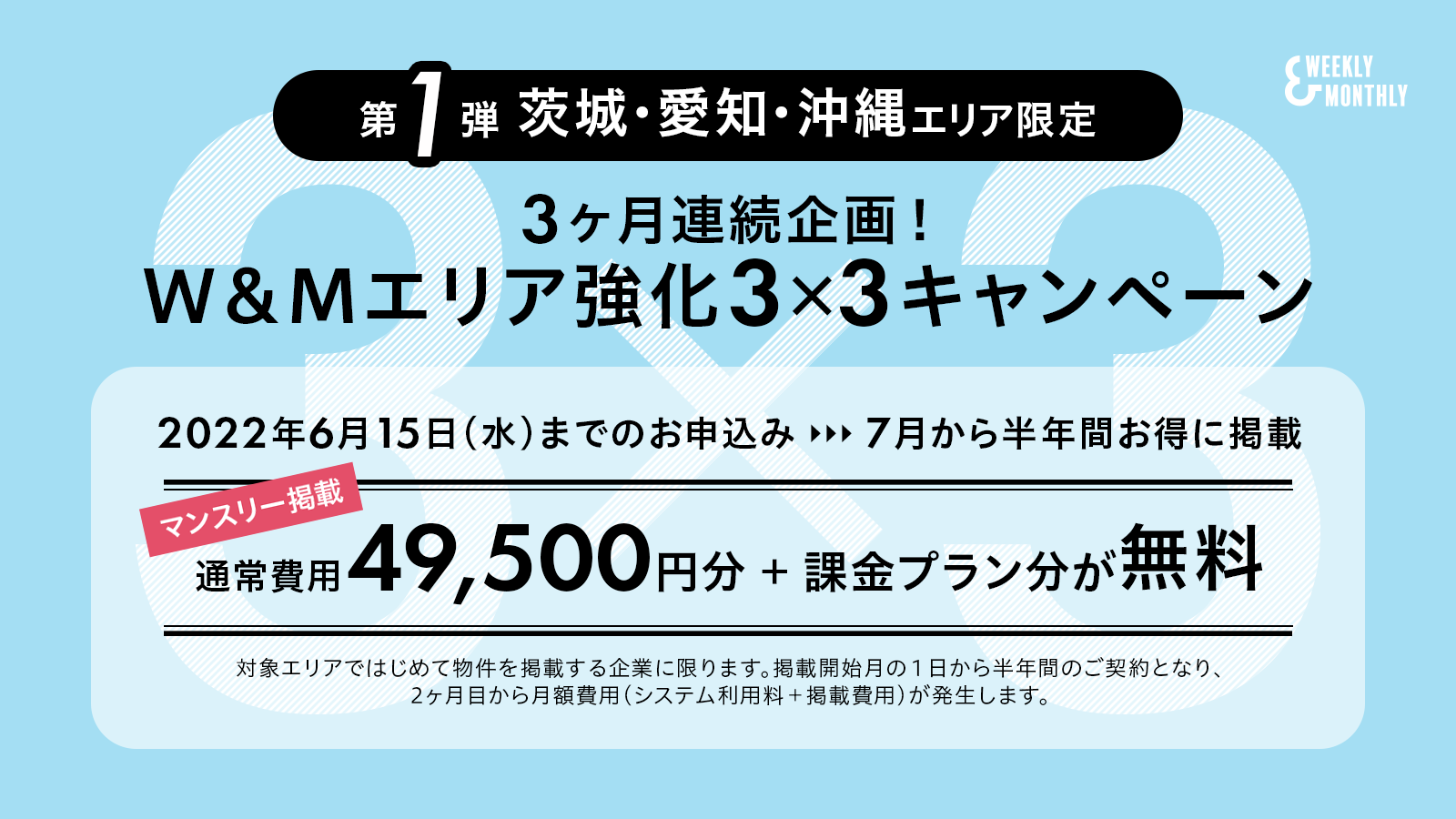 初月0円!【第1弾】茨城・愛知・沖縄の掲載限定、<3ヶ月連続企画>W&Mエリア強化3×3キャンペーン開始