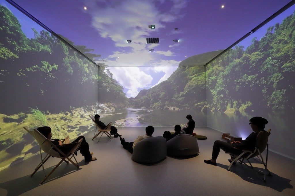 都会でも本物の自然空間にいるような感覚を味わえる「デジタル森林浴」。大型マルチスクリーンや音響、香りなどを駆使し、屋内で自然に包まれる体験を再現します。この体験では、実際に森林浴をしたときと近い水準の生理・心理的な改善効果が得られます。(提供:フォレストデジタル株式会社)