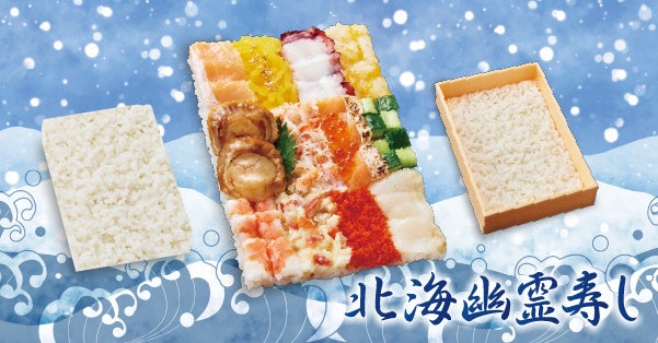 人気商品「幽霊寿し」が冬季バージョンで登場!!雪のように真っ白な舎利の下には、かにほぐし身や煮ほたて、大とろサーモン等の北海ネタがギッシリ入っています!