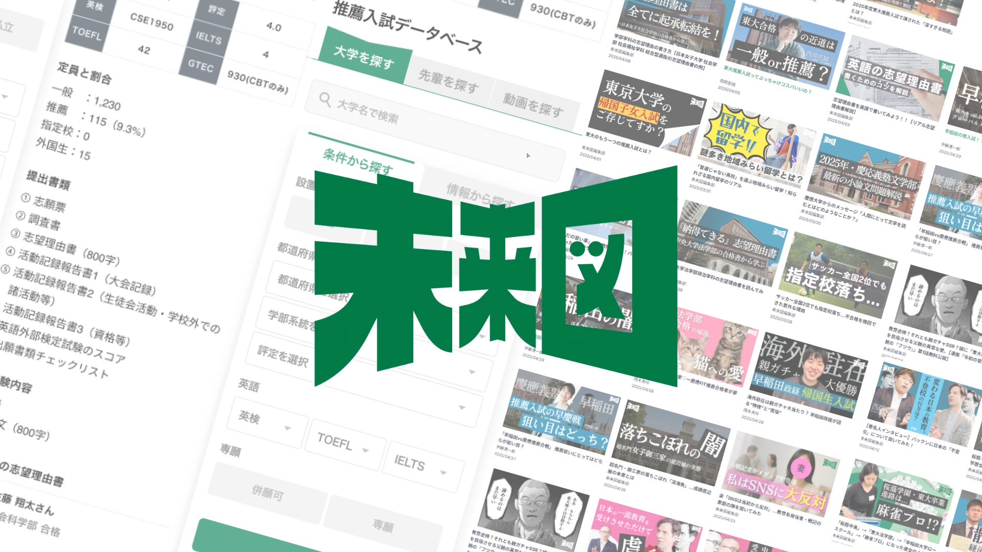 総合型選抜入試対策を中心とするオンライン予備校事業を展開し、推薦入試専門メディア「未来図」を運営するリザプロ株式会社(本社:東京都新宿区、代表取締役:孫辰洋)は、日本の主要大学の推薦入試情報を網羅的に集約した「推薦入試データベース」を6月25日にリリースいたします。