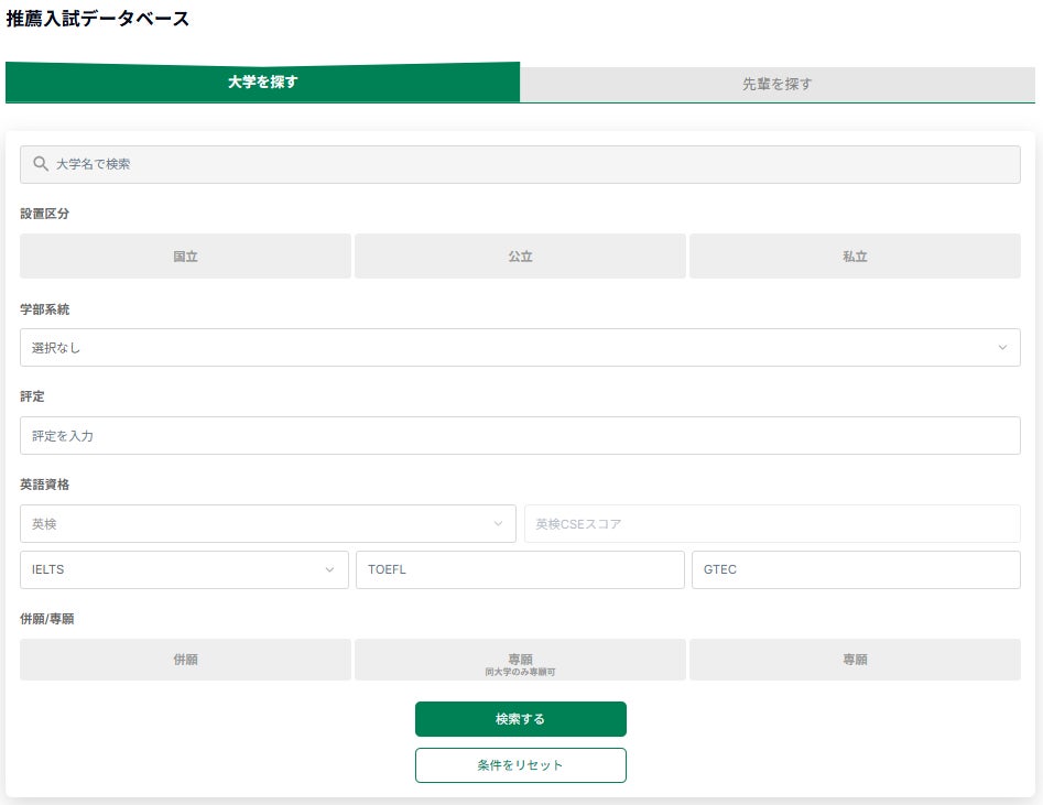 本データベースは、複雑化・多様化する推薦入試制度において、受験生が希望条件を絞り込んで検索することで出願可能な入試情報を効率的に取得でき、さらに実際の合格者の志望理由書も閲覧可能な、日本初の包括的な推薦入試情報プラットフォームです。