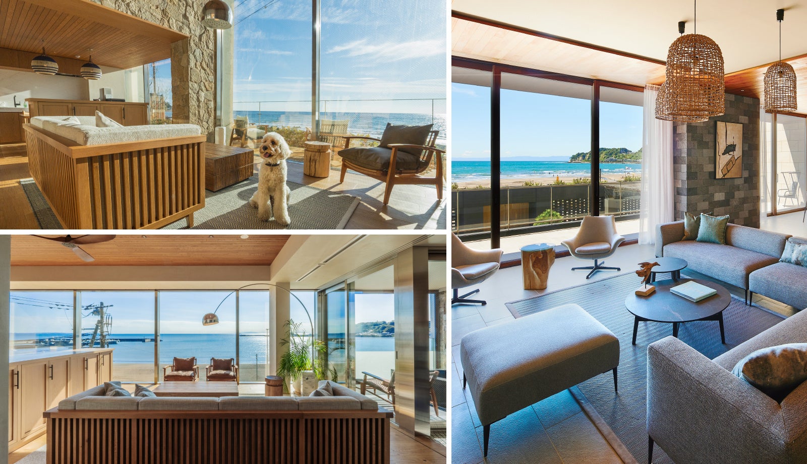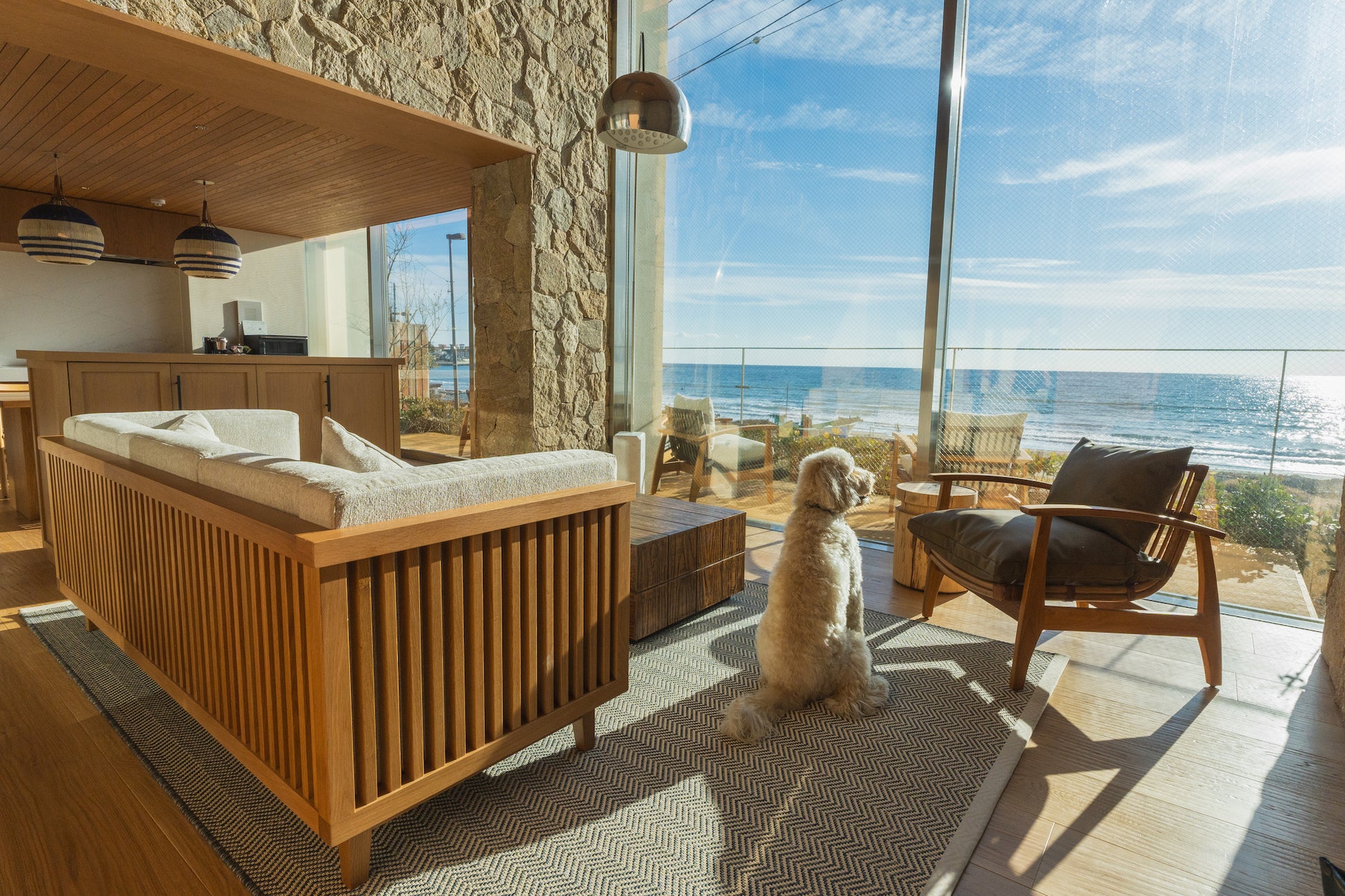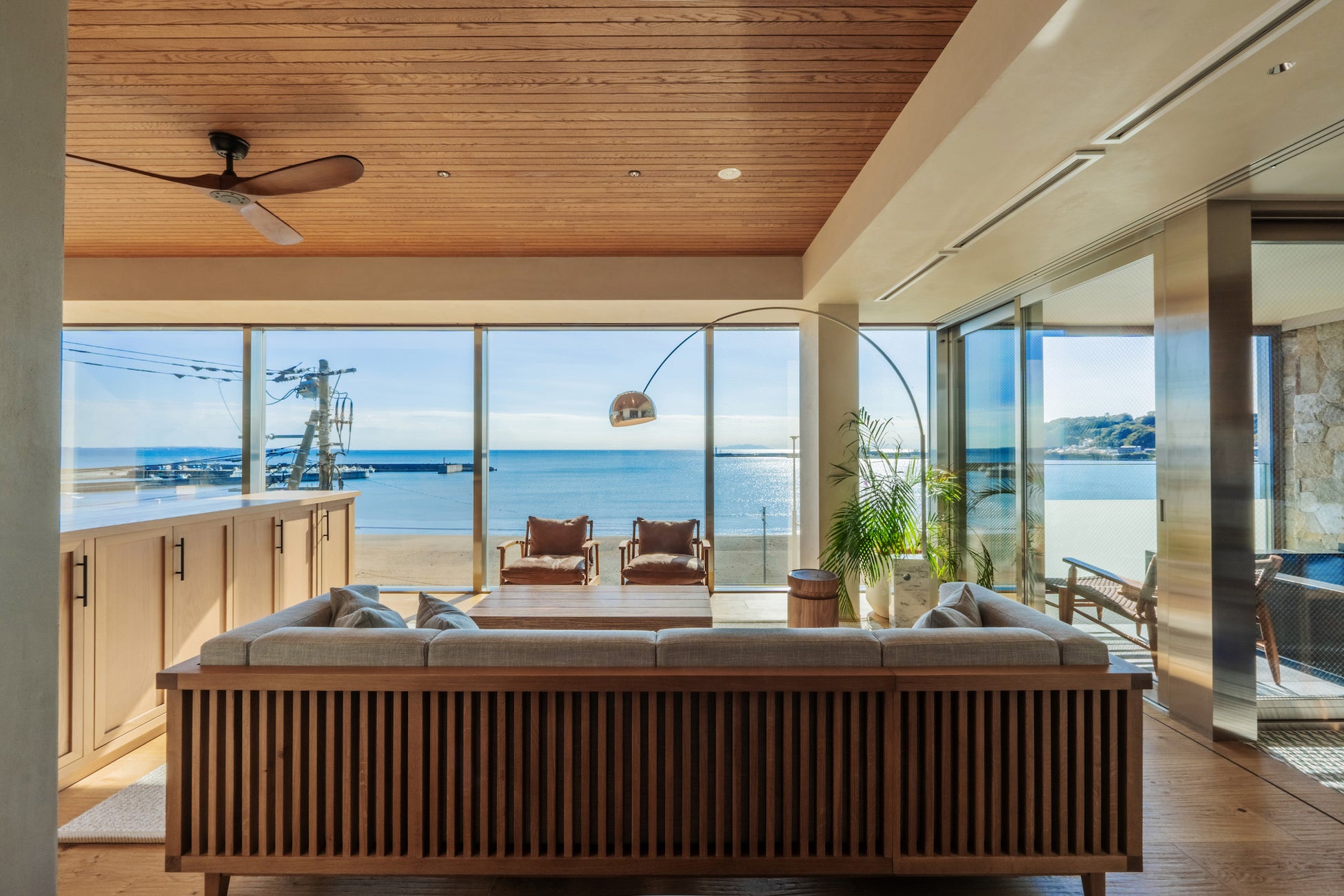 そして、今年2月17日に開業したのは「UMITO 鎌倉 材木座」です。ここはUMITO初となるペットと泊まれるラグジュアリーリゾートです。スキップフロア※を取り入れた開放的な建築が特徴的で、テラスにつながるリビングの天井高は3.35m。視覚的な奥行きと広がりが感じられる贅沢なしつらえです。材木座海岸から徒歩30秒という立地で、砂浜での愛犬とのお散歩にも最適な場所です。ケージやドッグフードなど、愛犬との滞在に欠かせないアイテムも拠点内に豊富にご用意しており、まさにペットフレンドリーなUMITOが新たに誕生いたしました。