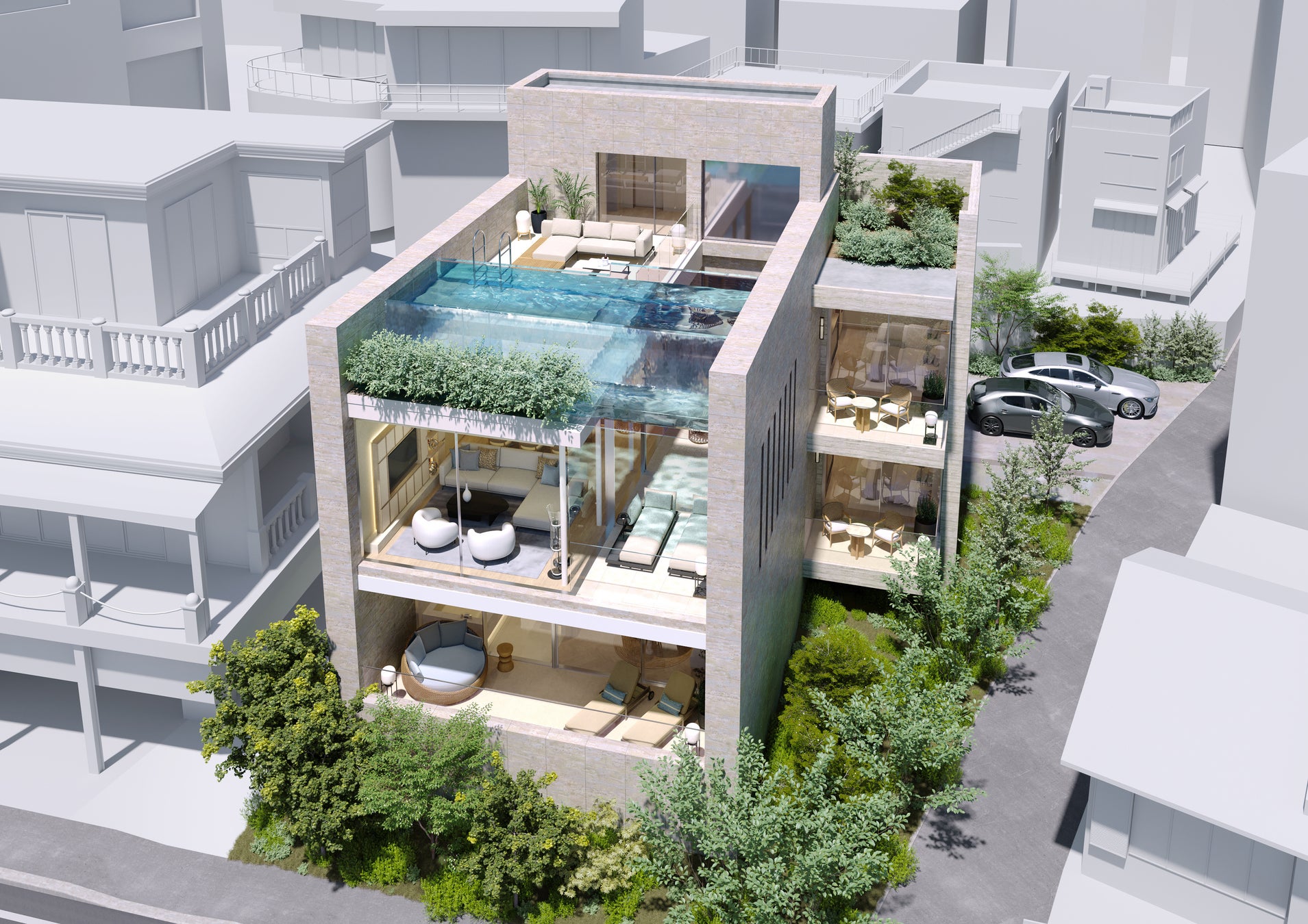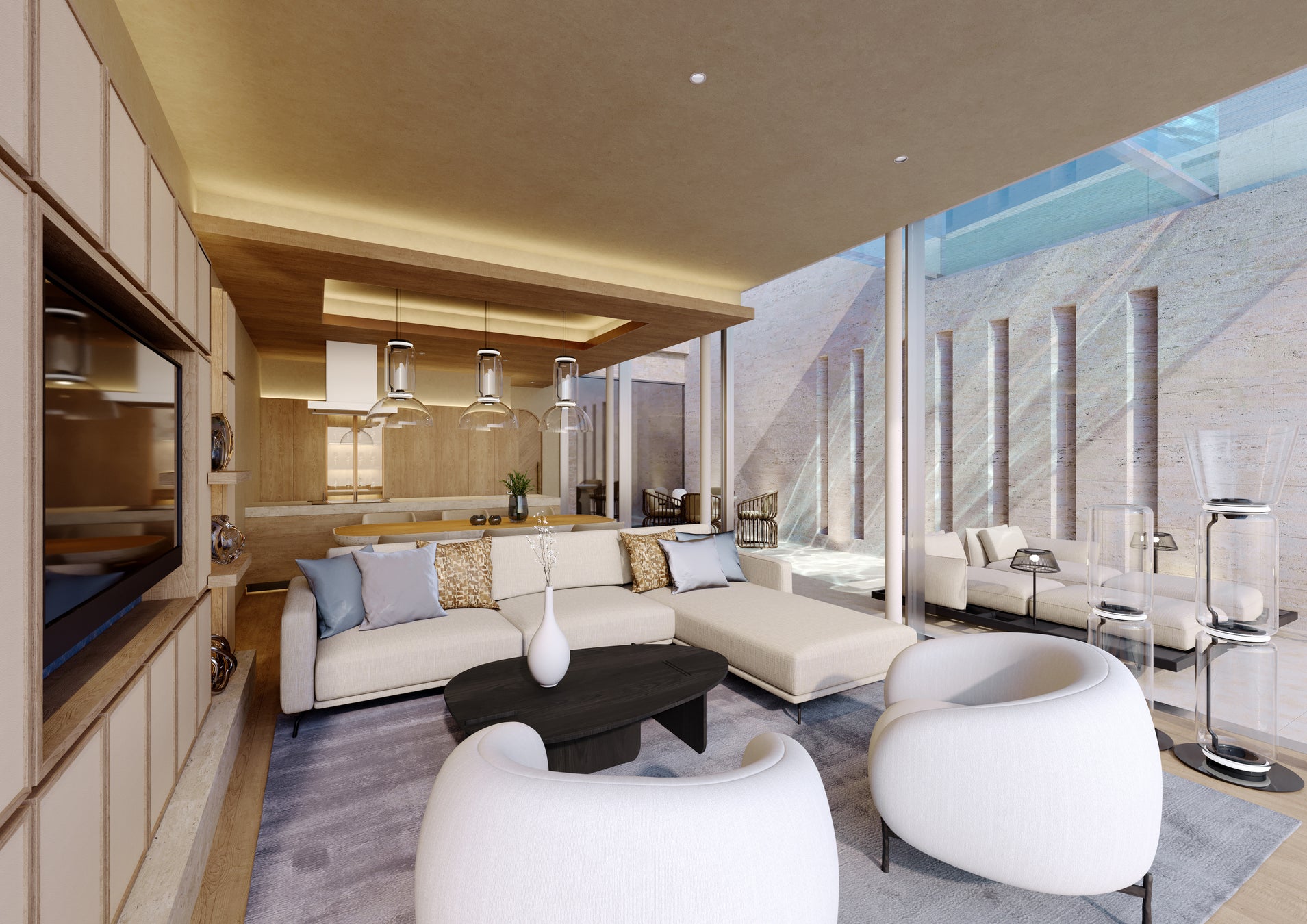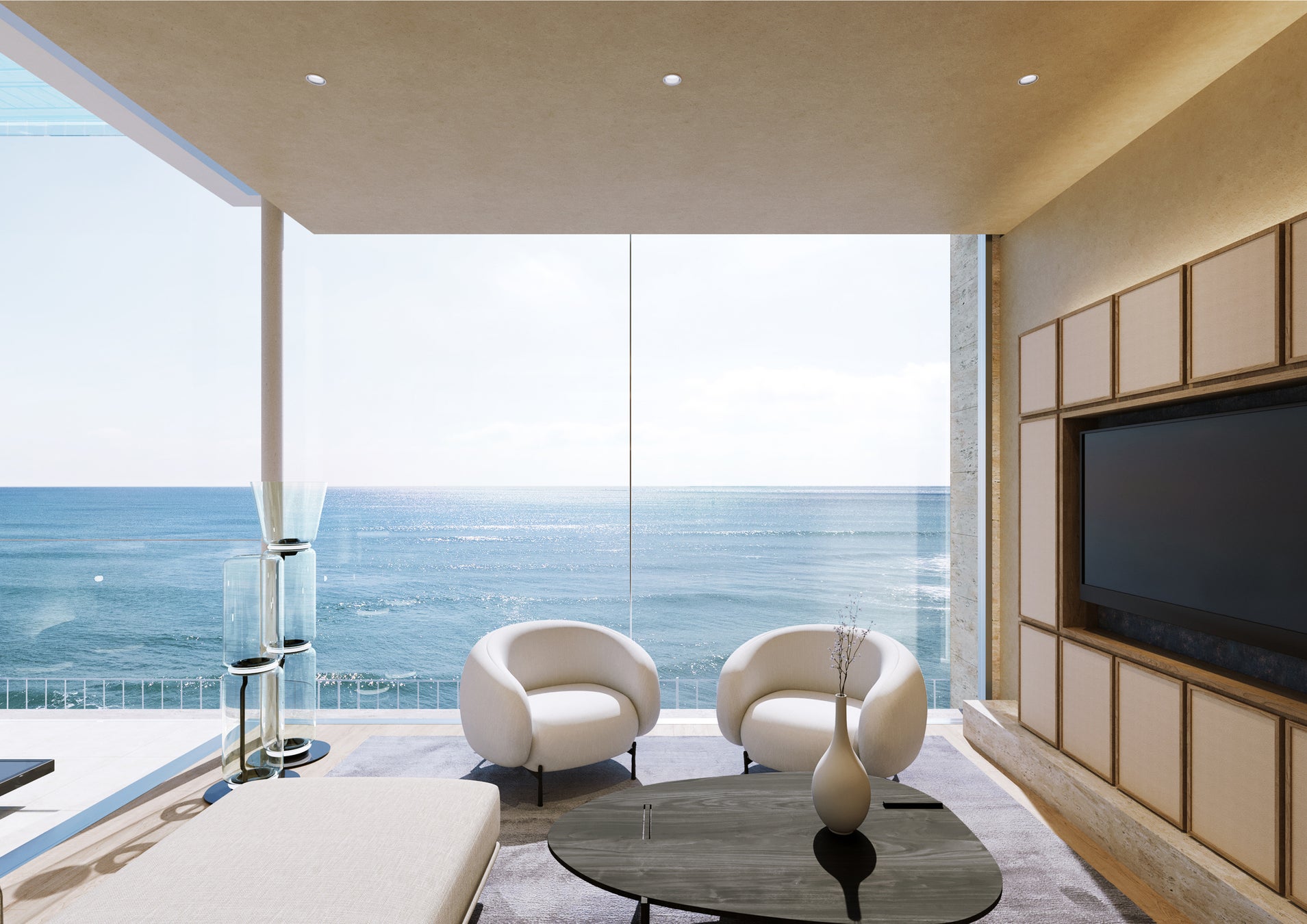 UMITOの中では最大規模を誇る邸宅で、5LDK・407㎡の広々とした空間は、隔たりのないオーシャンフロントの優雅なリビングルーム、海を全身で感じられるテラス直結のベッドルーム、バスルーム・サウナ・水風呂・外気浴を完備した重厚感ある庭園、屋上テラスで構成されています。