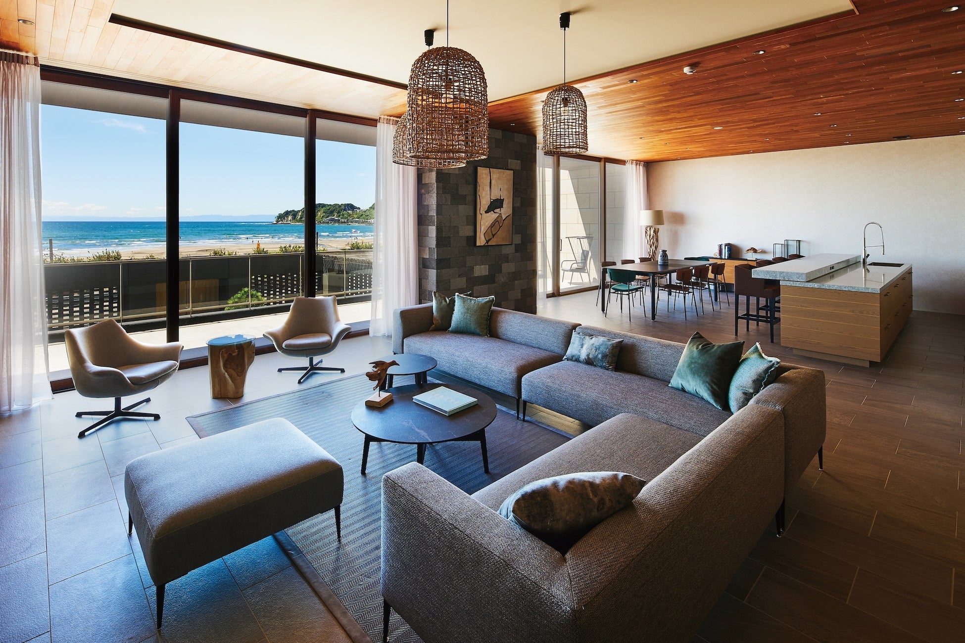 1日2組限定で、各フロア1室のみの客室は、130㎡超の2ベッドルームスイートで、ゆったりと余裕のある空間に。鎌倉の海を一面に望む贅沢で開放感あふれるリビングルームと露天風呂、サウナが完備され、都会での緊張感から解放され心からリラックスできる特別なステイを叶えます。