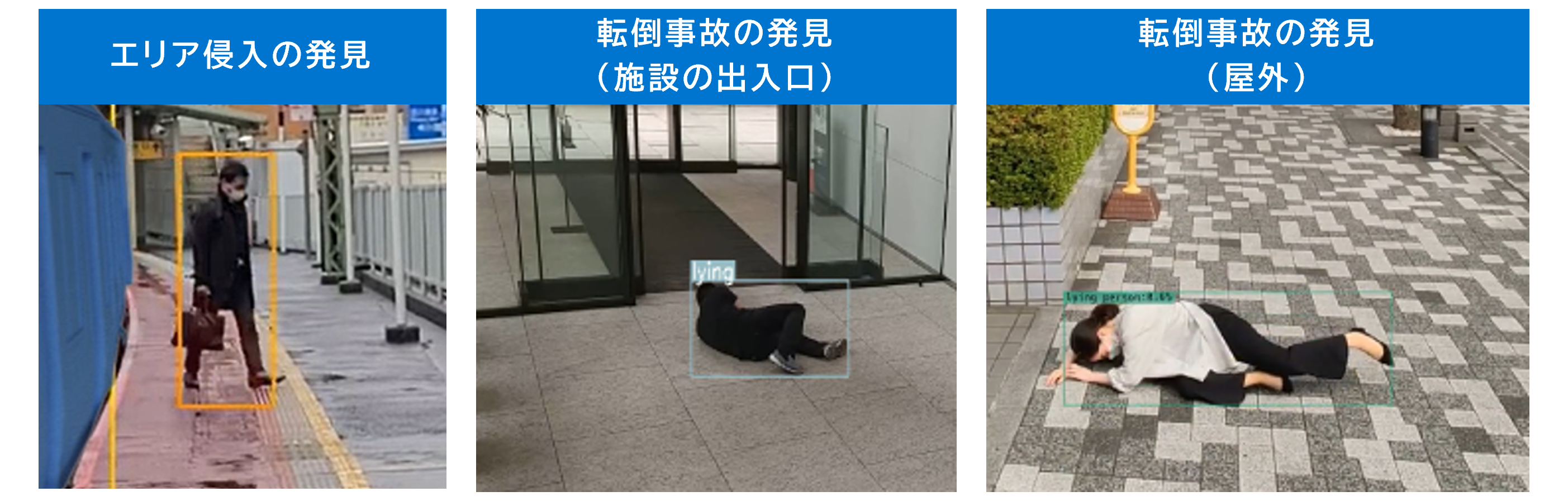 AIが監視カメラの画像を解析、エリア侵入や転倒事故の発見をお手伝いします。