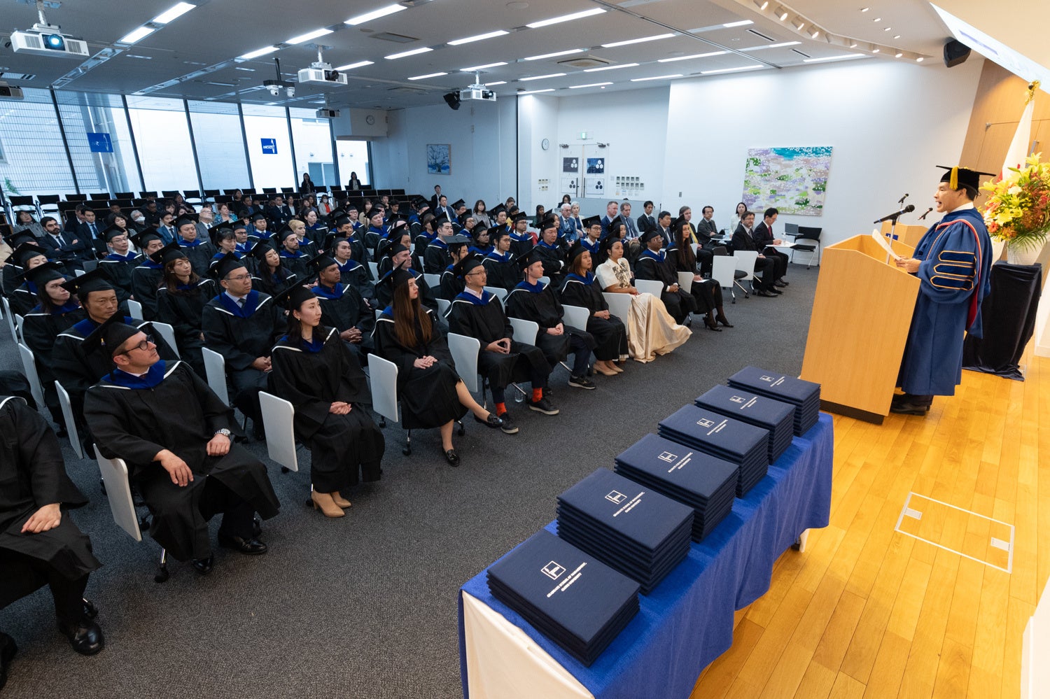 学長の堀義人は式辞で「試練や逆境は、自己を高める貴重な機会です。『コンフォートゾーン』に留まり続けると、成長の可能性を逸してしまいます。挑戦を楽しめるようになるには、その過程で立ちはだかる困難に立ち向かい、自身を引き上げることが必要です。ぜひ、勇気を持ってください。このサイクルを持ち続けることができれば、皆さんは次世代の人々の模範となることでしょう」と卒業生たちに激励の言葉を贈りました。