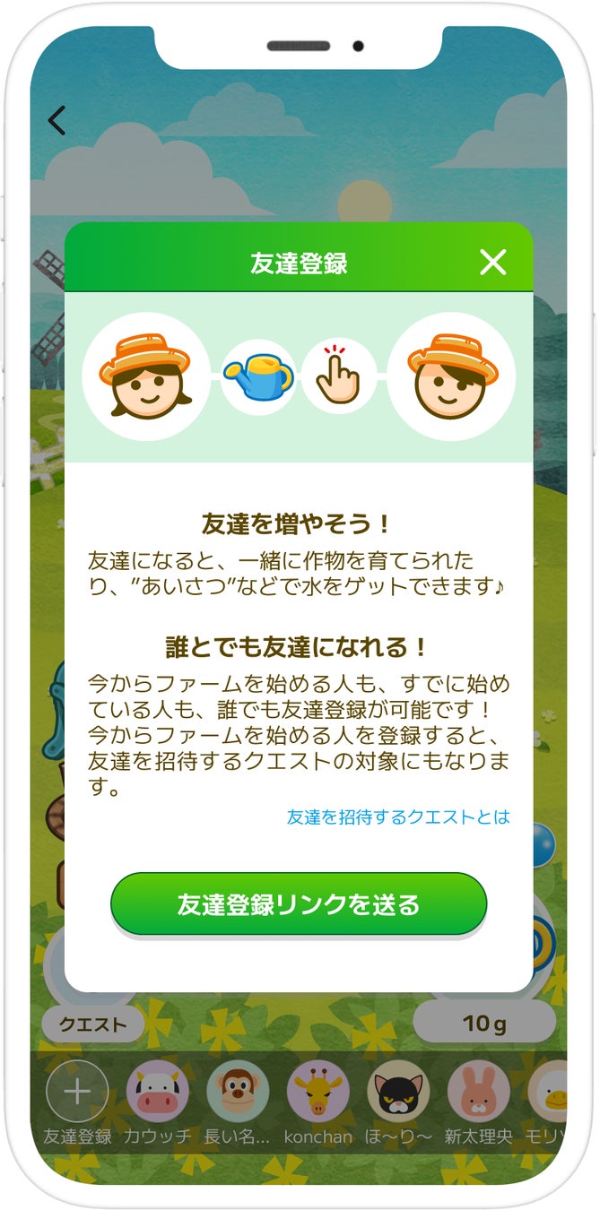 今回のアップデートにより、アプリ内の「友達登録リンク」を友人や家族、SNSの誰かと共有することで、お互いの農園に遊びに行くことができる様になります。訪問した農園では、友達に「あいさつ」をしたり、水やりをすることが可能です。友達の作物に水やりをすることで、自身の育てている作物の育成スピードが上がるなど、友達とのコミュニケーションを楽しめる仕掛けが施されています。