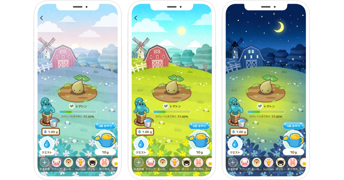また、農園内で、1日の変化が楽しめる様になります。朝・昼・晩と時間によって背景が変化したり、これまでは1日に1回だけ、水がもらえるクエストのチェックインができていたのが、朝昼晩と1日3回チェックインができるようになります。