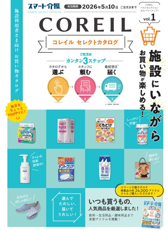 施設利用者ご自身が「スマート介護」の幅広い品揃えから商品を選んでお買い物ができる「お買い物サポートサービス COREIL(コレイル)」は、施設利用者、スタッフの方から高い支持を得ており、本カタログでもその利便性をご紹介しています。さらに地域限定サービスとしてスタートした生鮮食品などスーパーの商品を当日配送する「COREIL Fresh(コレイルフレッシュ」も掲載しています。