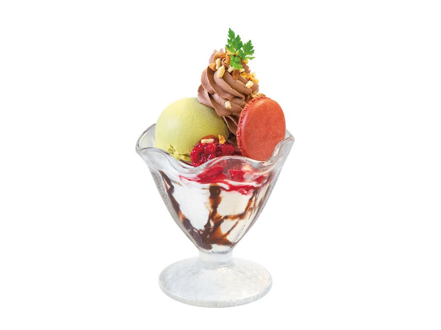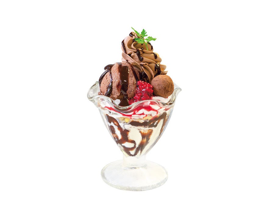 チョコをふんだんに使い、ピスタチオのアイスをトッピングしたパフェ。チョコは濃厚で、ピスタチオアイスは優しくほのかな香りで上品な味。口に入れた瞬間、チョコとピスタチオが一緒にとろけあい、贅沢気分を味わえます。下にはフランボワーズソースが入っており、甘酸っぱくサッパリした味もお楽しみ頂けます。