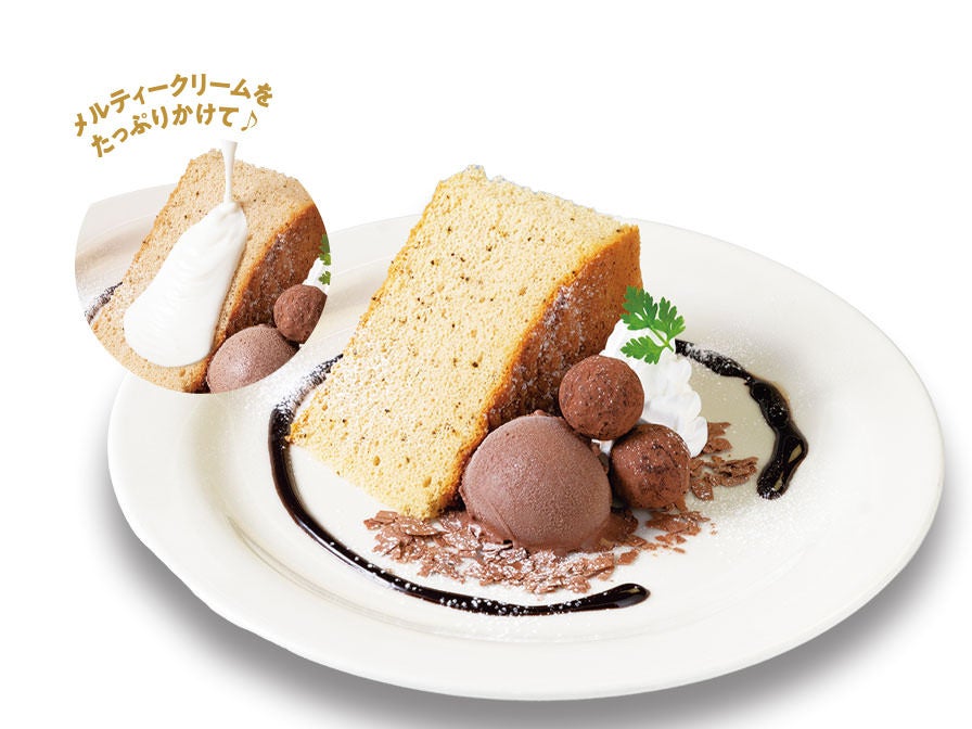 紅茶が香るシフォンケーキにトッピングのメルティークリームをかけると優しい甘さに。濃くビターな味わいのチョコとの程よいバランス