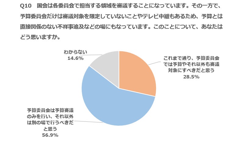 - 衆参予算委員会が予算とは直接関係ない不祥事追及などの場になっていることに関し「予算委は予算審議のみを行い、それ以外は別の場で行うべきだと思う」が56.9%を占めた。支持政党別に見ると、立憲民主党とれいわ新選組を除いた野党支持者の過半数が「予算委は予算審議のみを行い、それ以外は別の場で行うべきだと思う」とし、社民党の8割が最多で、日本維新の会と国民民主党の7割台が続いた。自民党の支持者は6割台だった。(Q10)