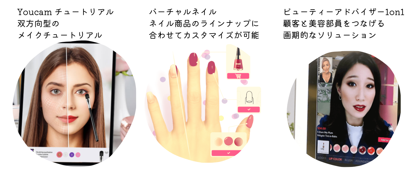 出展ブースでは弊社のバーチャルメイクをはじめとするAR&AI技術を搭載した機能はもちろん、スマートフォンやタブレット端末に映した自分の顔にブラシのオーバーレイアニメーションが投影され、アイメイクやチークなどのメイクのハウツーがステップごとにAR体験できる最新サービス「YouCam チュートリアル」や、アウトカメラにかざした手元でバーチャルのネイル体験ができる機能、更にお客様と美容部員をオンラインで繋げる「BA 1 on 1」などを体験頂けます。