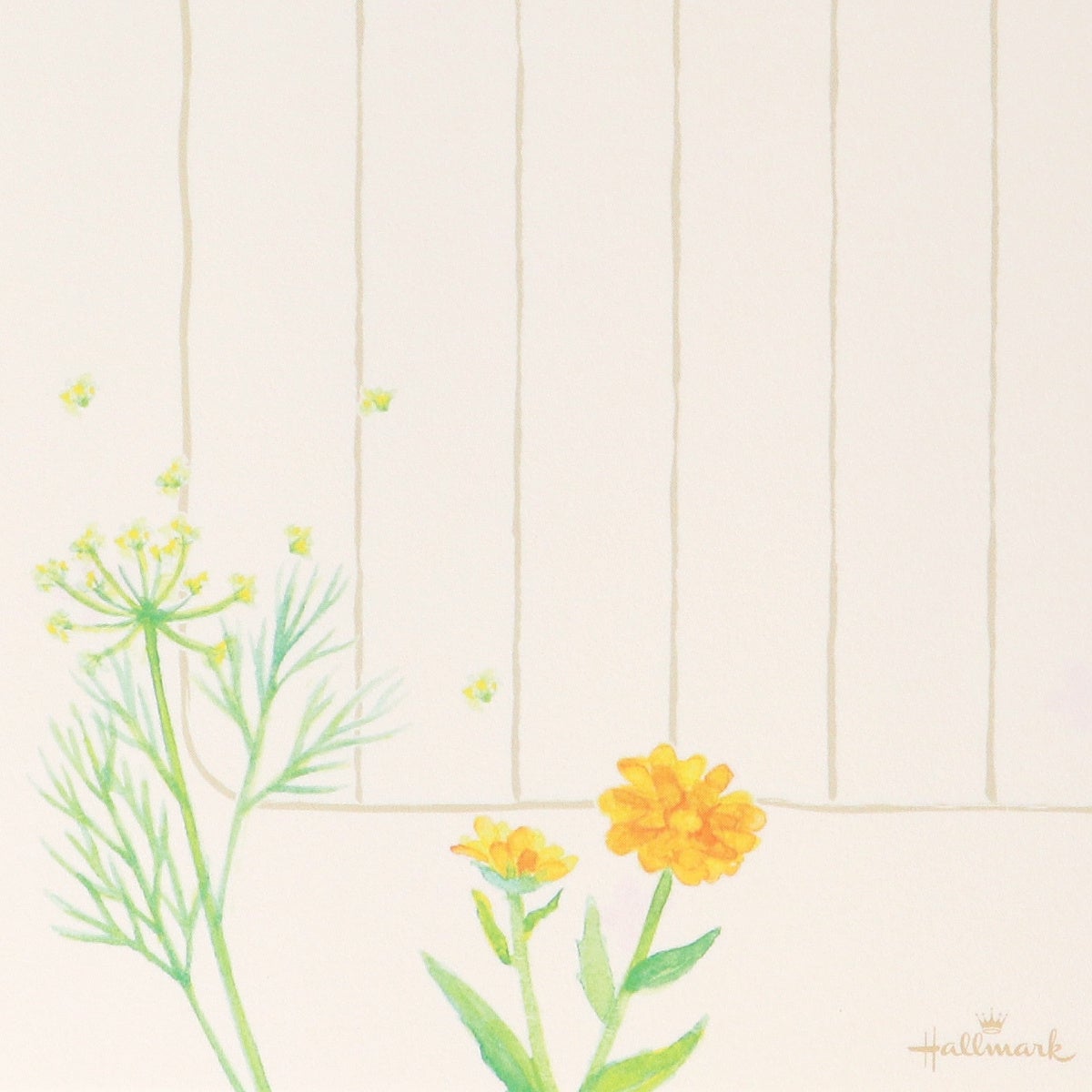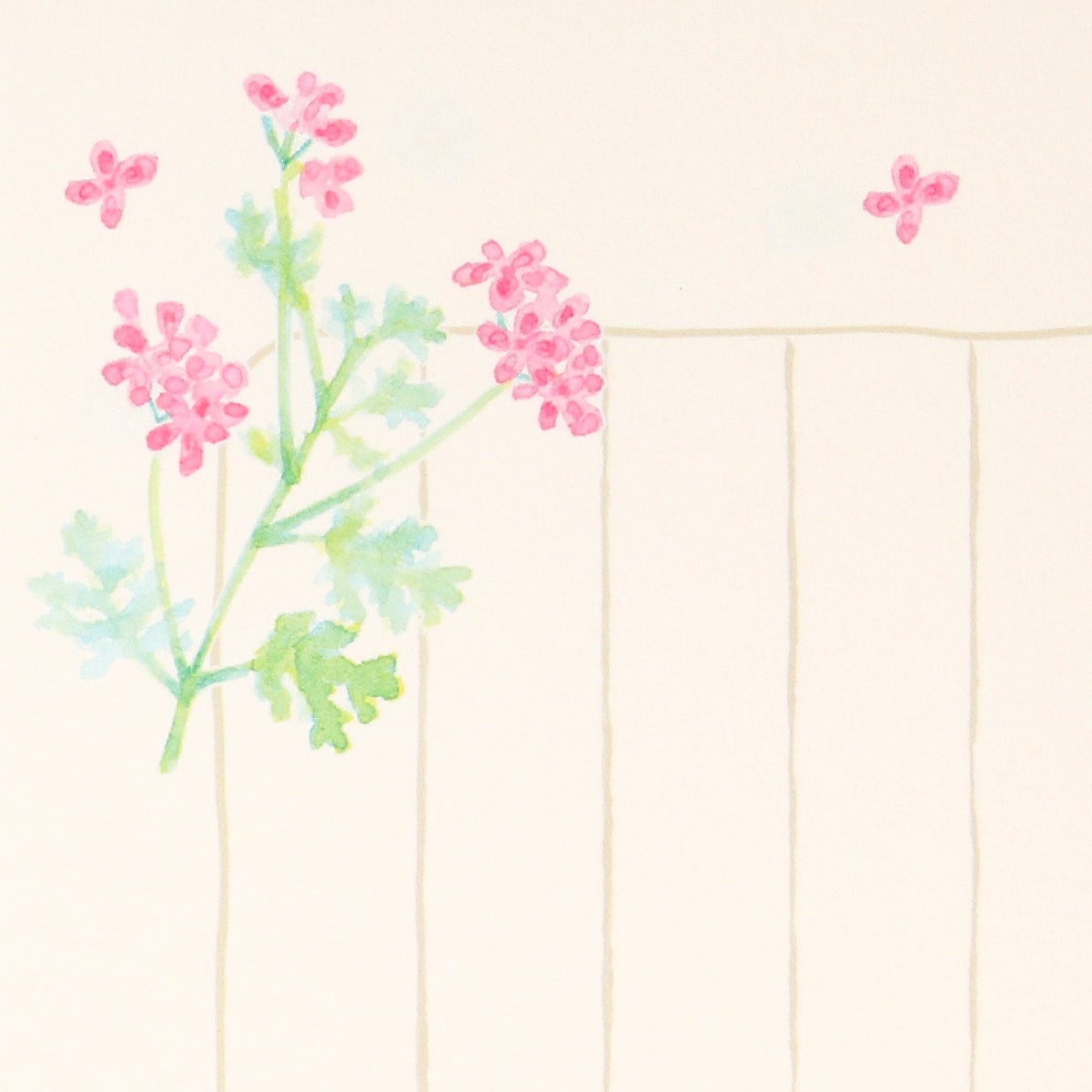 みずみずしいゼラニウム、輝くキンセンカ、優美なカモミール、穏やかなラベンダー、芳しいセージ。摘みたてのハーブの香りがそっと立ちのぼる場面をイメージしながら、水彩のやわらかなタッチで花々を描きました。