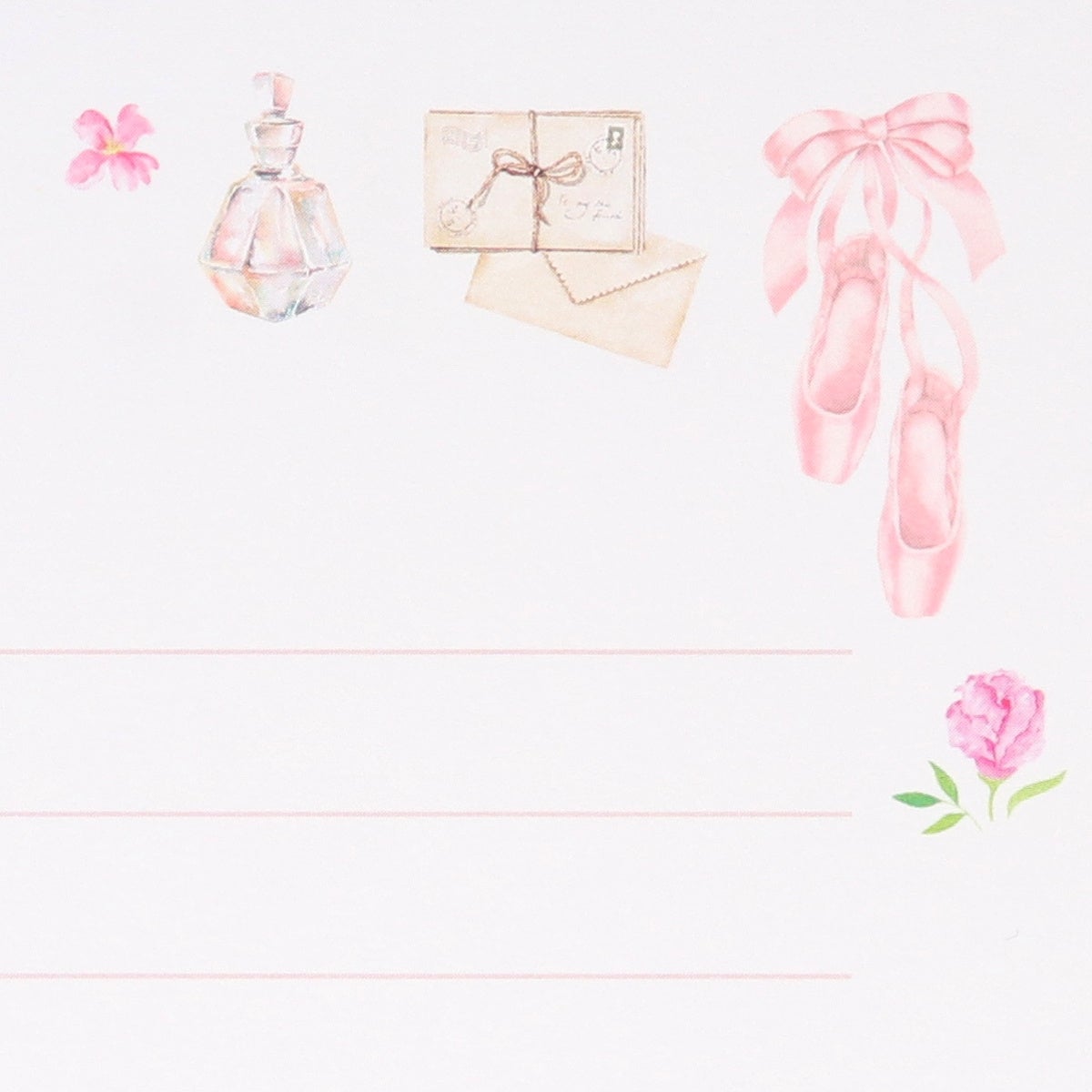バレエシューズやアンティークのティーカップ、香水瓶、ブーケなど、心ときめく小物たちを集めました。甘くなりすぎないグレイッシュなピンクを使い、大人も使いやすいフェミニンなデザインに仕上げています。