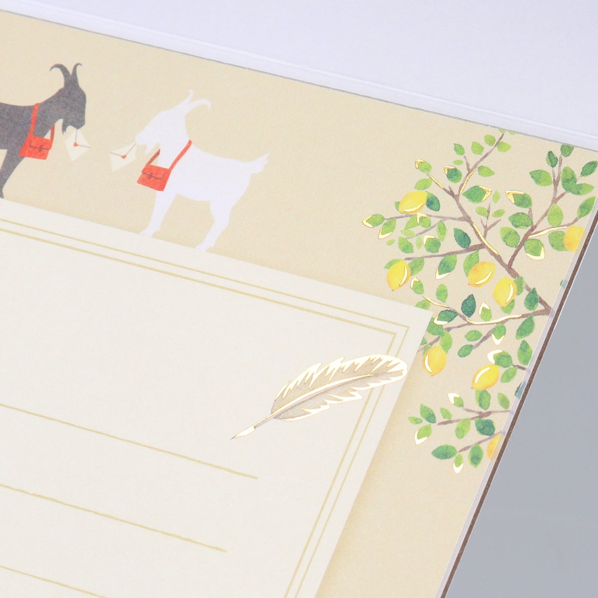 お手紙を書くシーンと親和性の高い童謡「やぎさんゆうびん」の世界観をテーマに、海外の絵本の装丁をイメージしてデザインしました。お手紙の左下がヤギにかじられたようになっているあしらいがチャームポイントです。