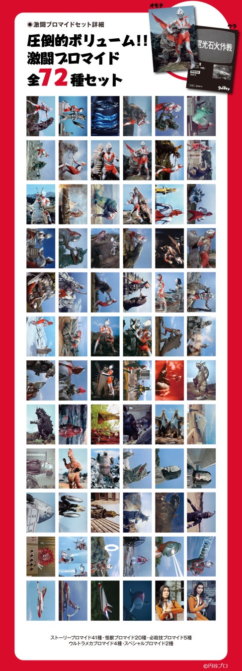 ストーリーや怪獣などのワンショットを収めた激闘ブロマイドは圧倒的なボリュームで全72種セット!