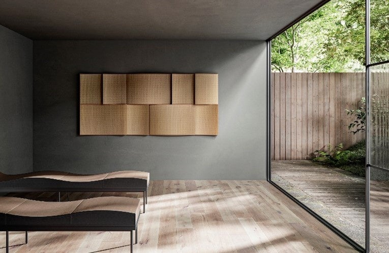 い草の表情を引き出す織の緩やかな曲線造形と、機能的に優れた吸音性能を持つウォールパネル。色味と形状の組み合わせにより、壁面に多彩な表情を引き出します。