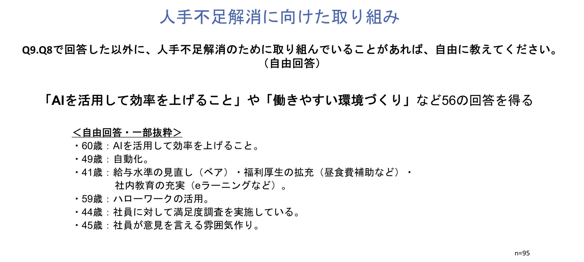 Q8で「わからない/答えられない」「取り組んでいない」以外を回答した方に、「Q9.Q8で回答した以外に、人手不足解消のために取り組んでいることがあれば、自由に教えてください。」と質問したところ、「AIを活用して効率を上げること」や「働きやすい環境づくり」など56の回答を得ることができました。