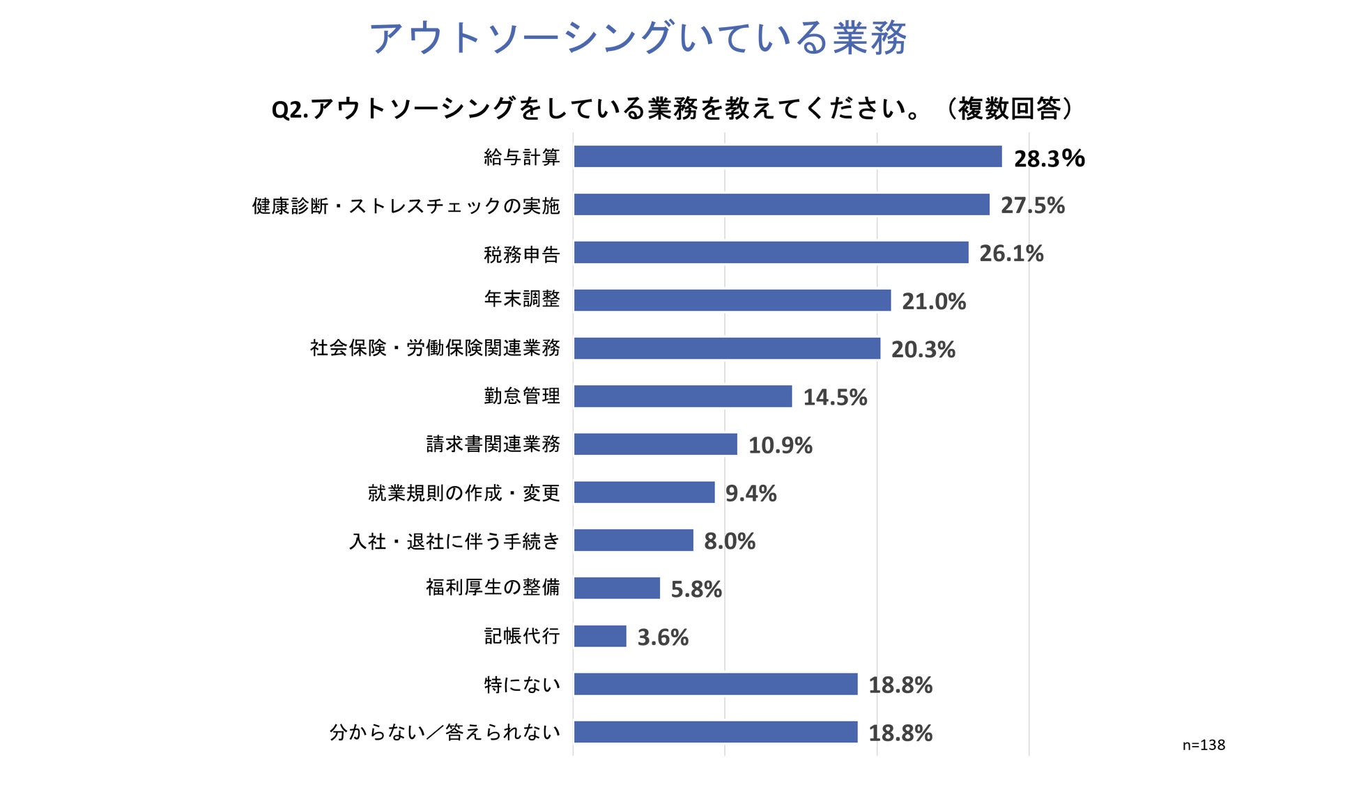 「Q2.アウトソーシングをしている業務を教えてください。」と質問したところ、「給与計算」が28.3%、「健康診断・ストレスチェックの実施」が27.5%、「税務申告」が26.1%という回答となりました。
