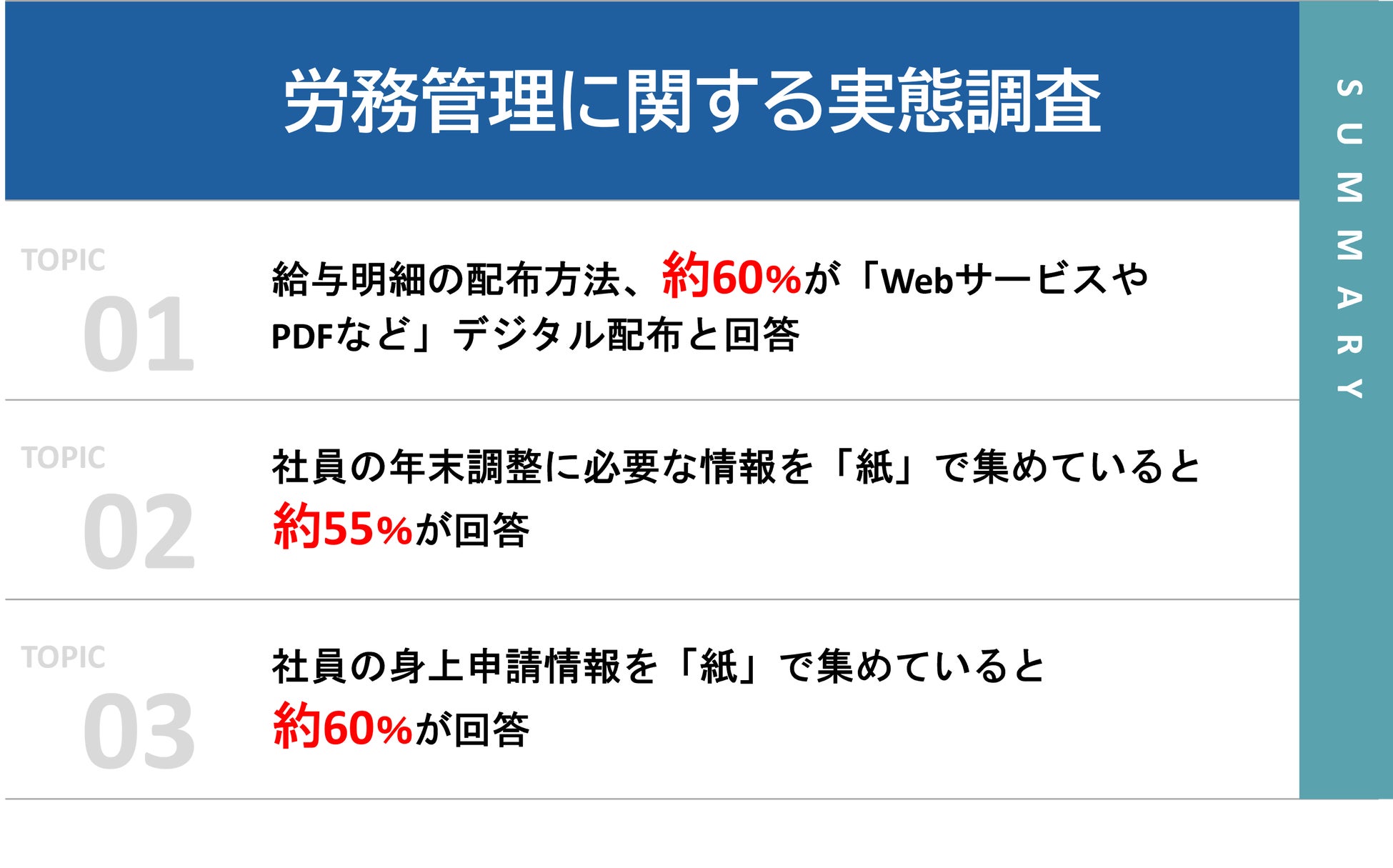 今回の調査では、デジタル時代にあっても紙ベースの業務が多くの中小企業で続いている実態が明らかになりました。効率化やDXの推進が急務とされる中、給与明細の配布や年末調整、身上異動届の情報収集に紙を使用している企業が多数あり、旧来の業務プロセスからの脱却が課題として挙げられるのではないでしょうか。業務のデジタル化を推進し、紙ベースのプロセスを電子化することで、企業はより柔軟で迅速な業務運営を実現し、働き方改革や生産性の向上に貢献することが期待されます。