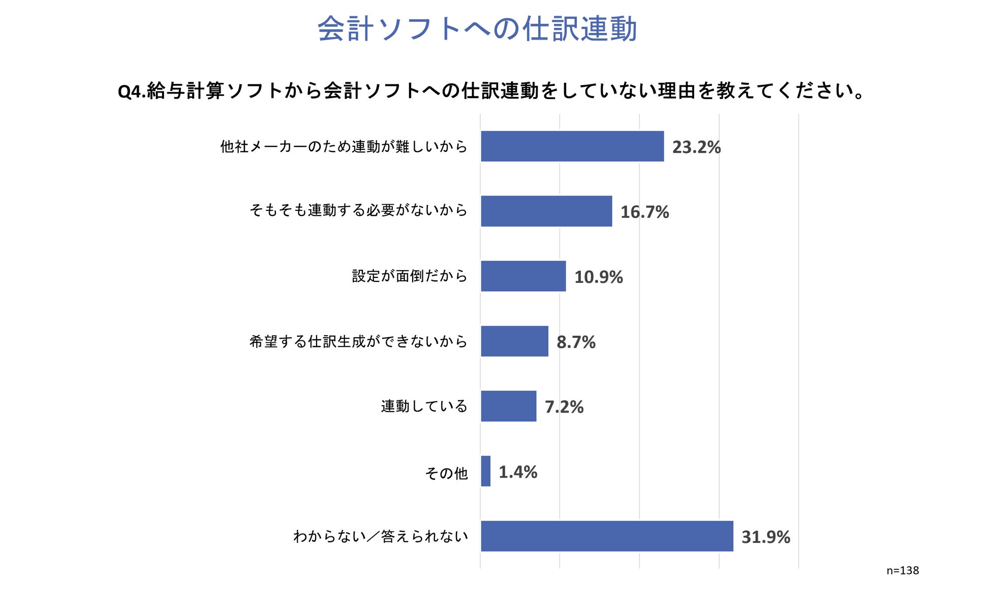 「Q4.給与計算ソフトから会計ソフトへの仕訳連動をしていない理由を教えてください。」と質問したところ、「他社メーカーのため連動が難しいから」が23.2%、「そもそも連動する必要がないから」が16.7%、「設定が面倒だから」が10.9%という回答となりました。