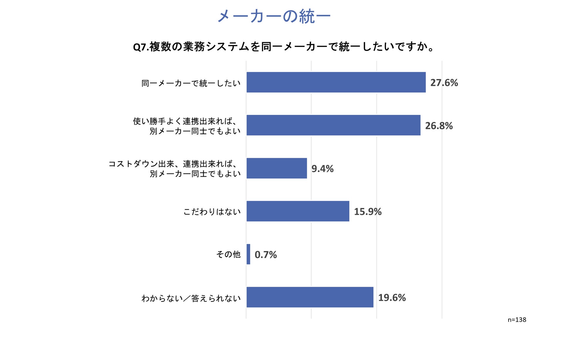 「Q7.複数の業務システムを同一メーカーで統一したいですか。」と質問したところ、「同一メーカーで統一したい」が27.6%、「使い勝手よく連携出来れば、別メーカー同士でもよい」が26.8%という回答となりました。