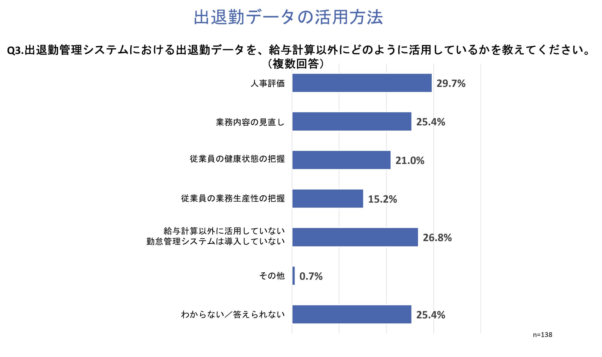 「Q3.出退勤管理システムにおける出退勤データを、給与計算以外にどのように活用しているかを教えてください。」と質問したところ、「人事評価」が29.7%、「業務内容の見直し」が25.4%、「従業員の健康状態の把握」が21.0%という回答となりました。